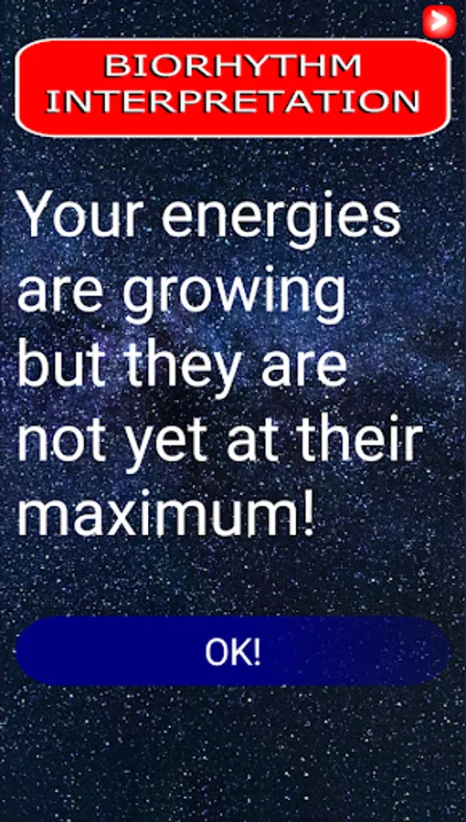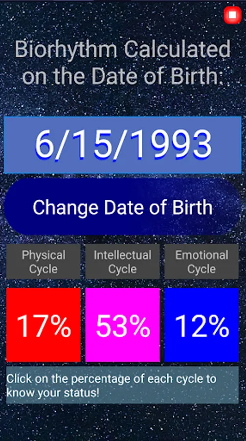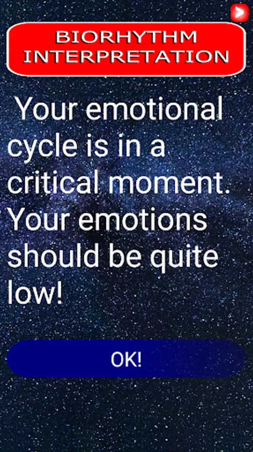 With this app you will be able to know whenever you want the state of your physical cycle (linked to daily energies), intellectual cycle (linked to logical and rational abilities) and emotional cycle (linked to the emotional component). Once you have entered your date of birth, you will be shown the percentage of each cycle you are in and you can evaluate the changes in your status over time. In addition, for each cycle you will be given an interpretation of your current biorhythm situation.