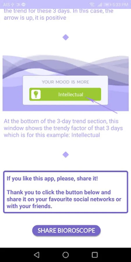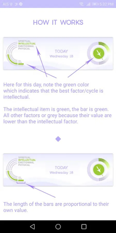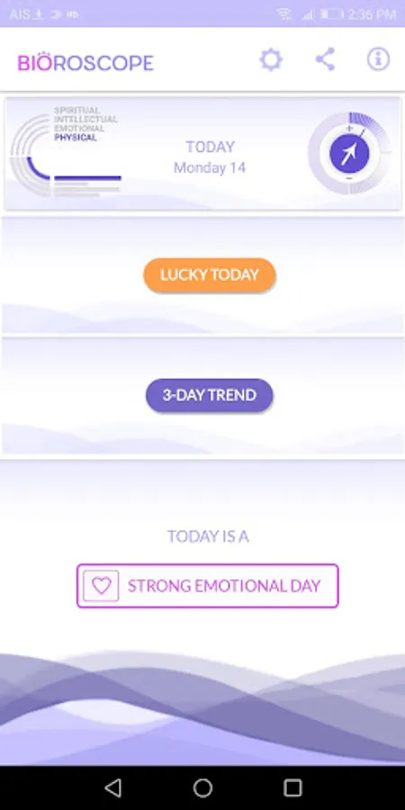 Based on biorhythm calculations, spiritual and intuitive cycles, Bioroscope makes a mix of all these factors to give you an overall wellness / well-being index.