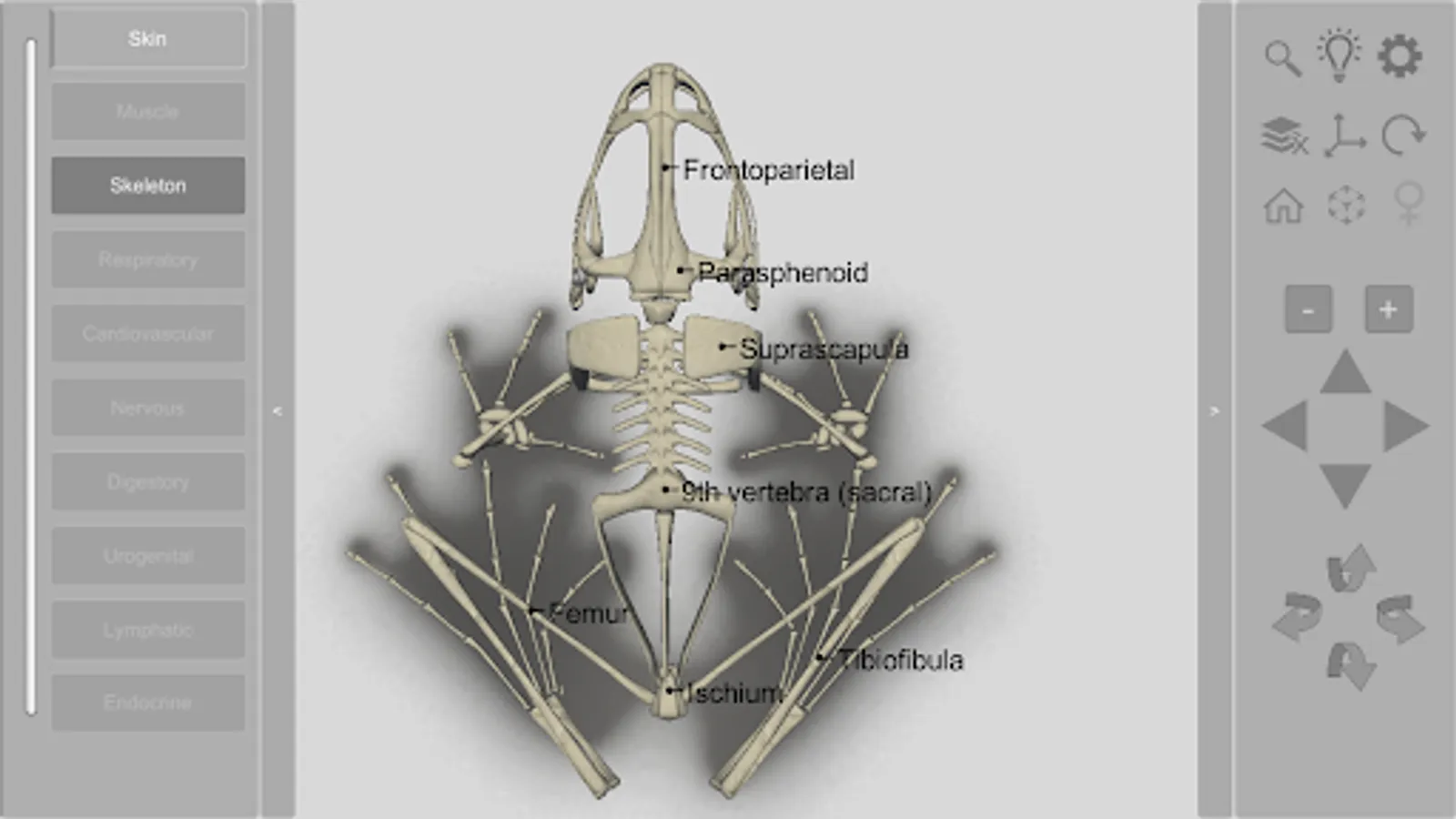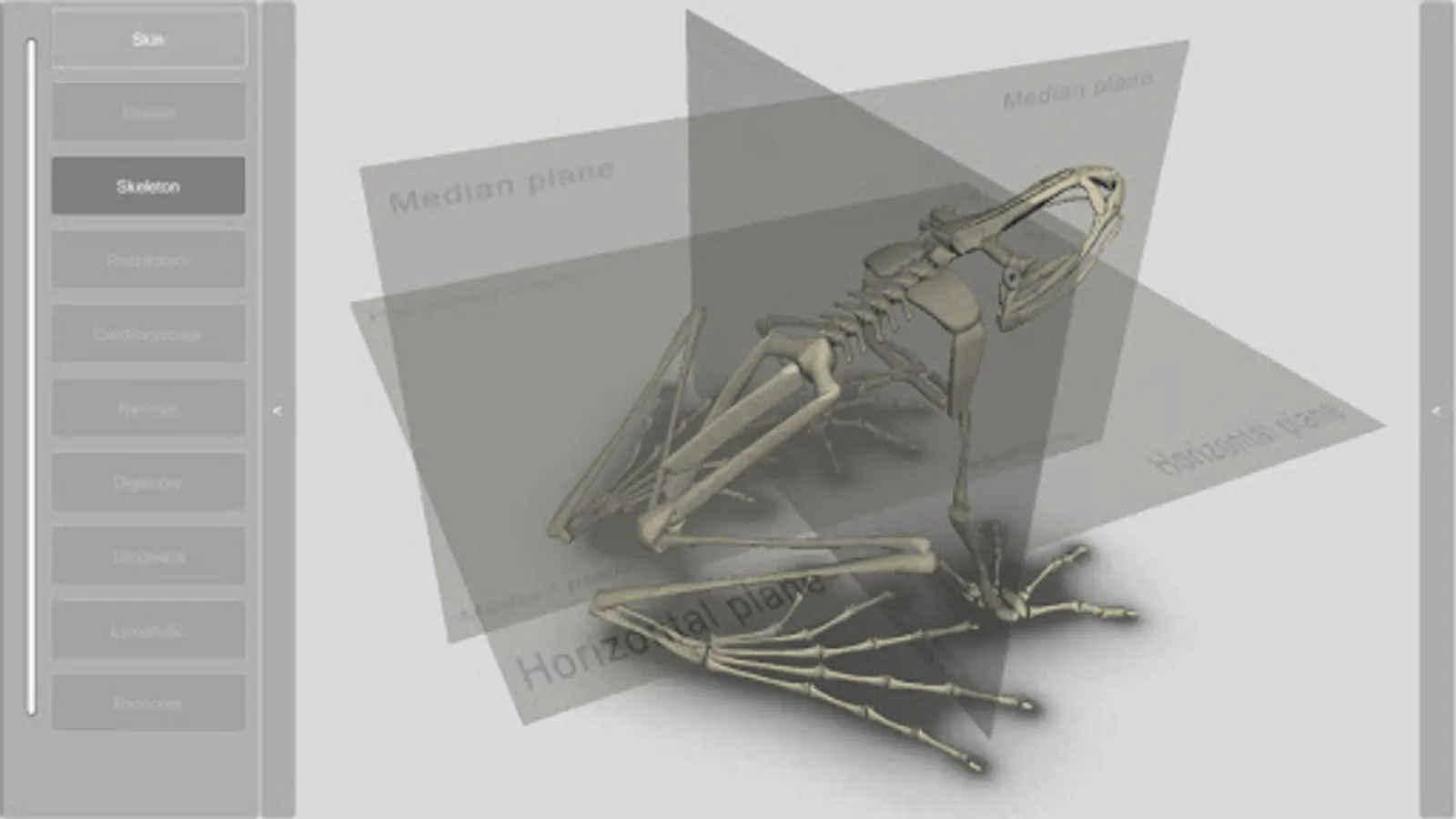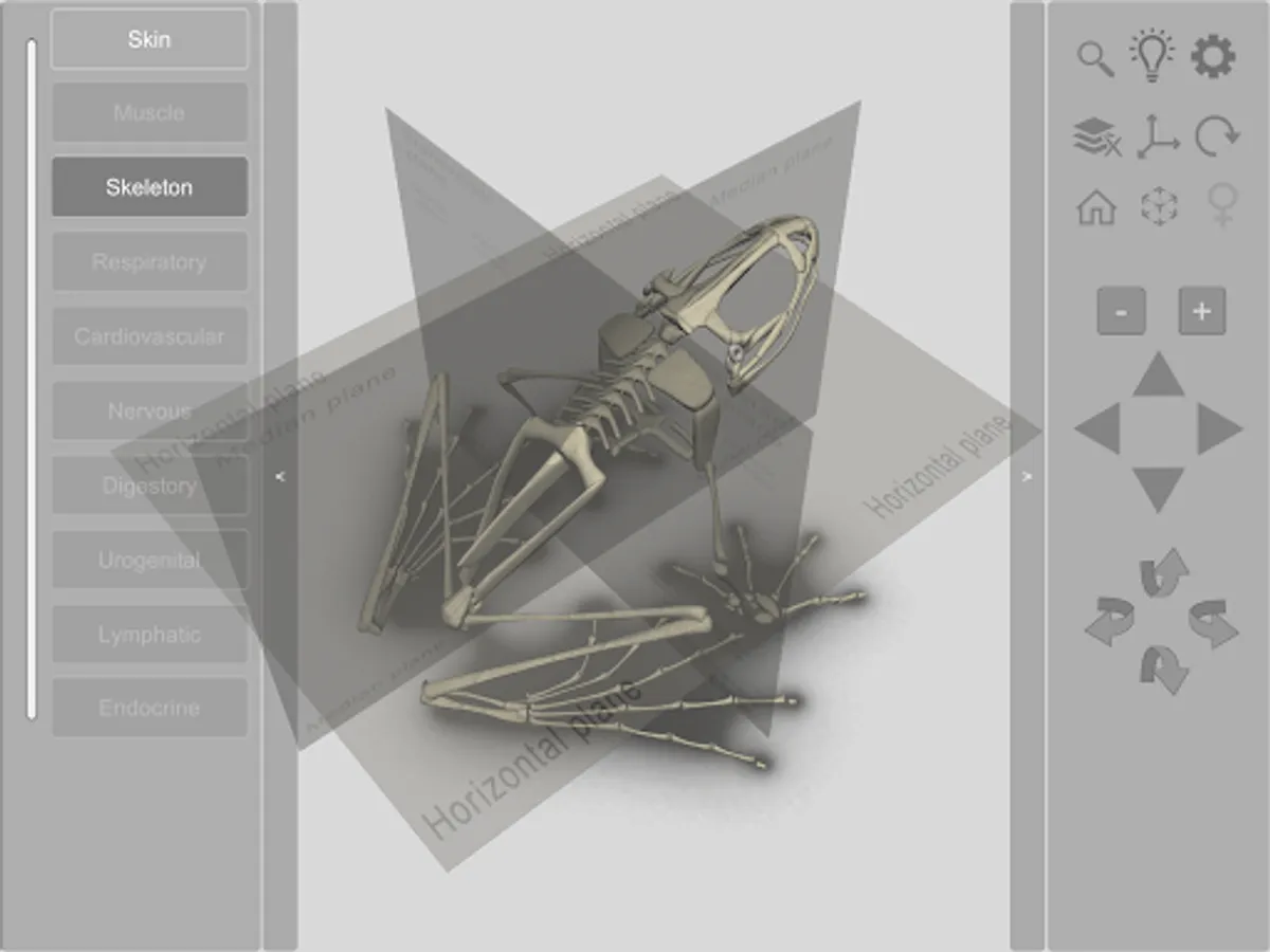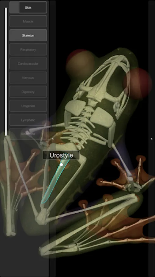 An interactive 3D model of an anuran amphibian. Simpler than our other apps, this free app allows you to view the animal’s integument (skin) and details of the skeleton.