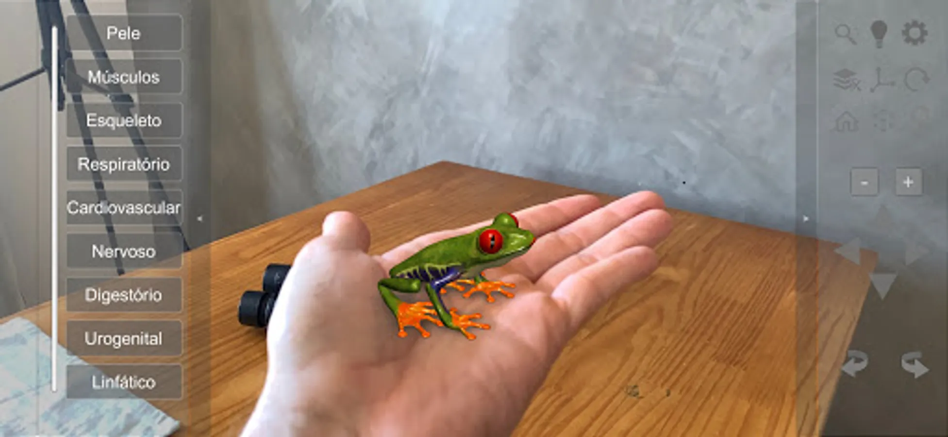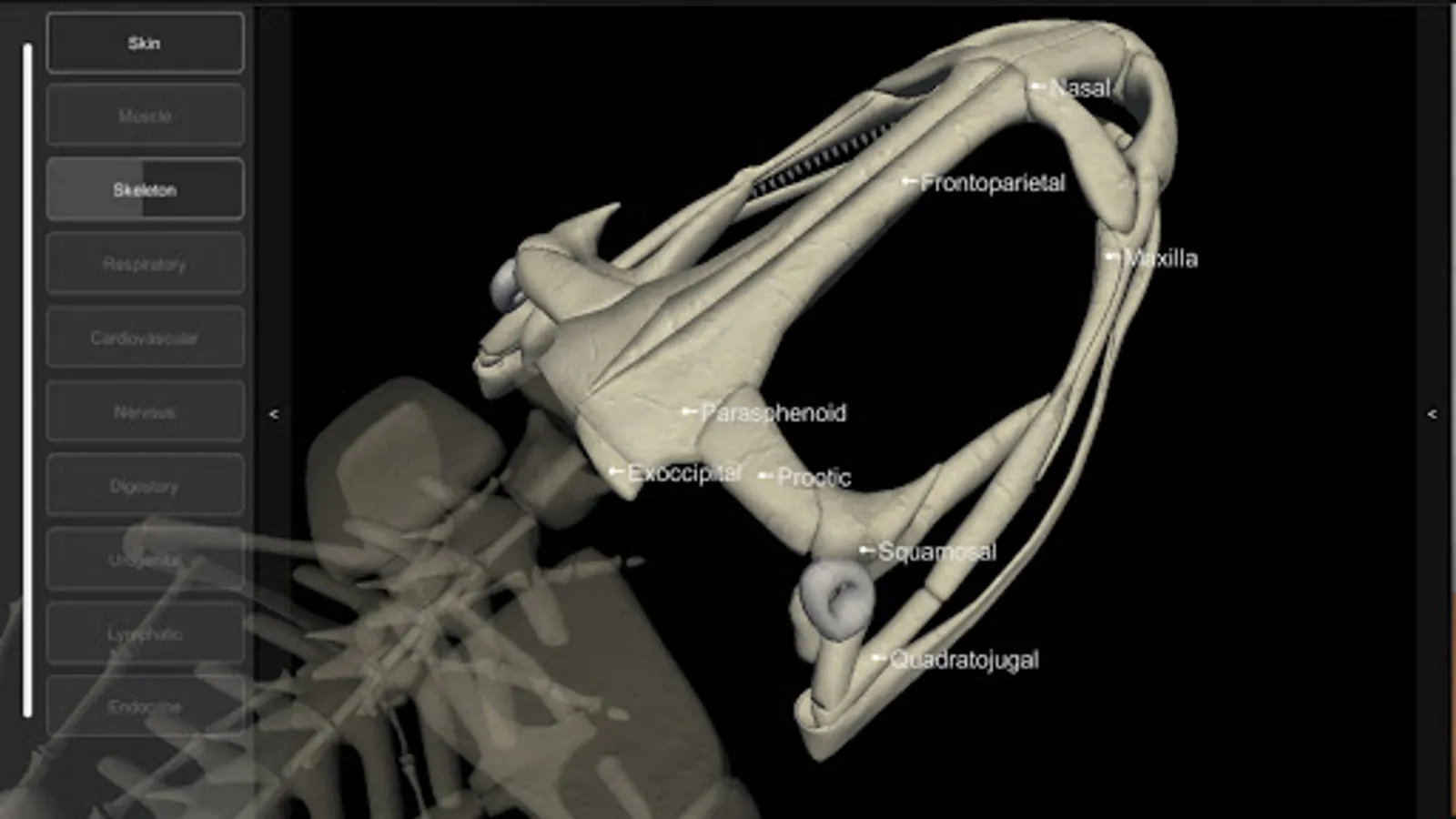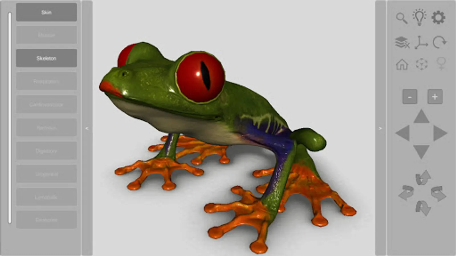 An interactive 3D model of an anuran amphibian. Simpler than our other apps, this free app allows you to view the animal’s integument (skin) and details of the skeleton.