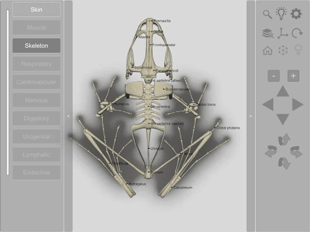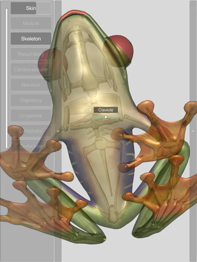 The 3D Frog Skeleton app is an interactive model that allows you to view the integument and skeletal system of an anuran amphibian (a red-eyed treefrog, Agalychnis callidryas). Each bone can be individually highlighted and display a caption with its name.