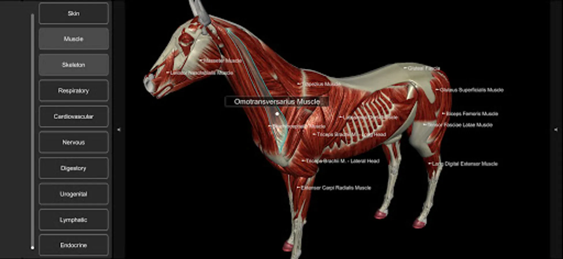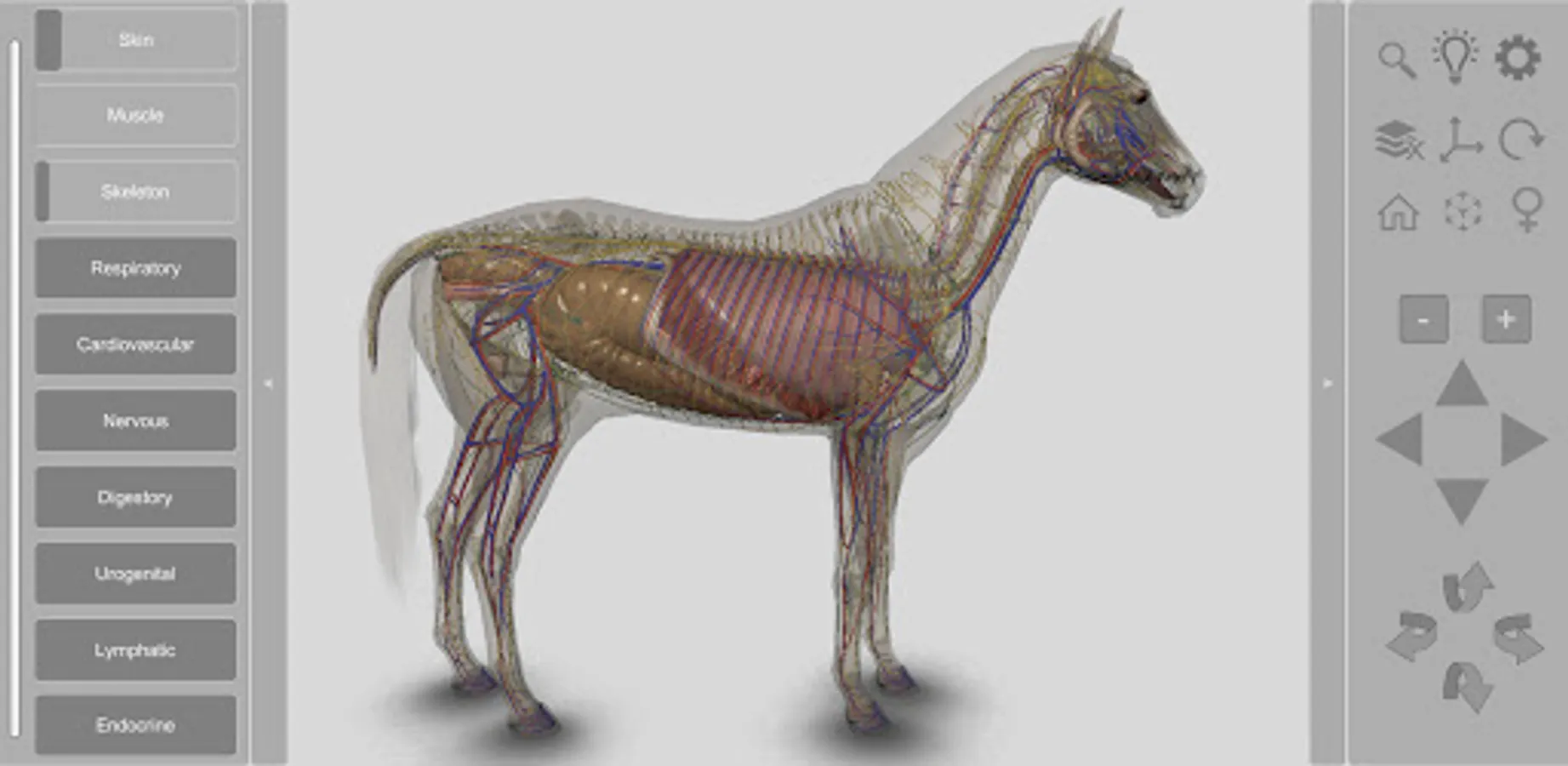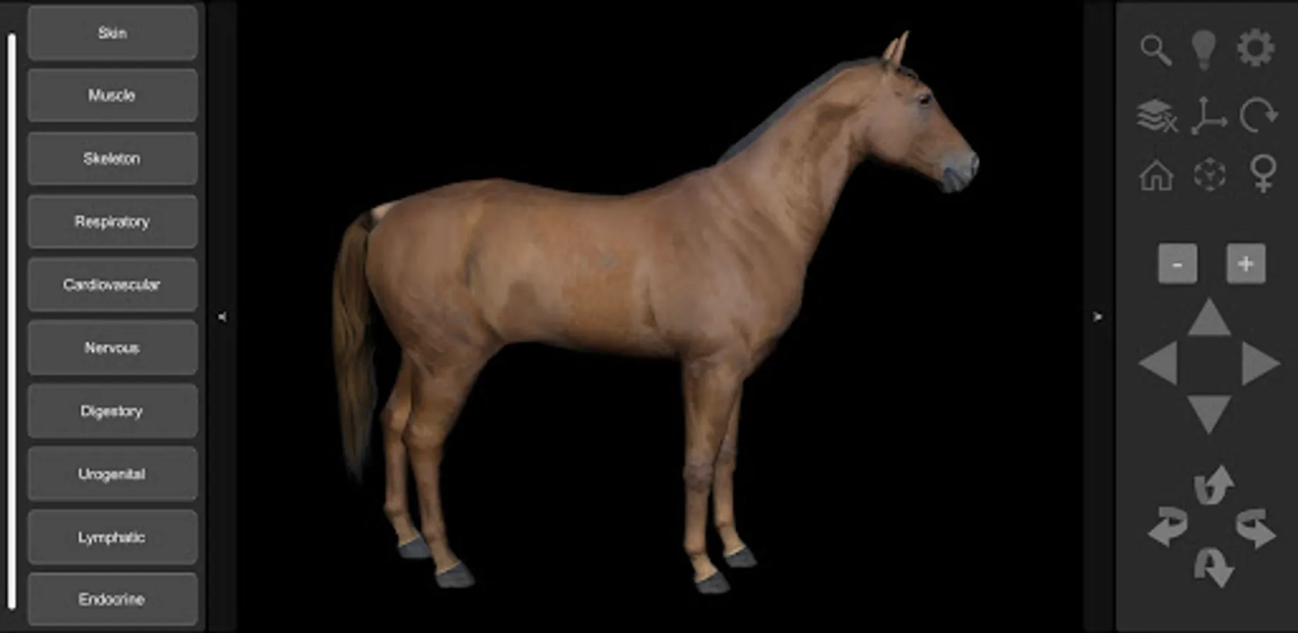 The 3D Horse Anatomy App lets you explore a detailed three-dimensional model of an Equine. Internal systems can be viewed and manipulated layer by layer or simultaneously with other layers, at various zoom levels. Individual anatomical structures can be highlighted and display a caption, or they can be removed to permit viewing of deeper structures.