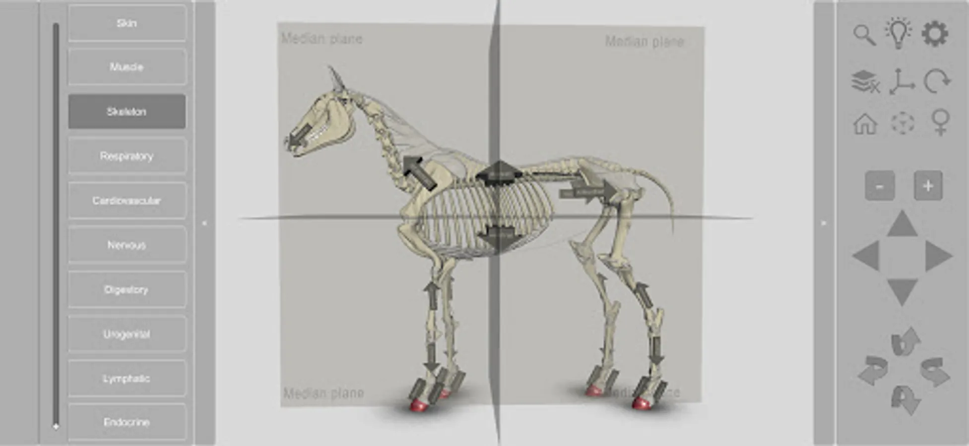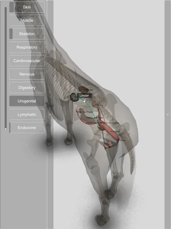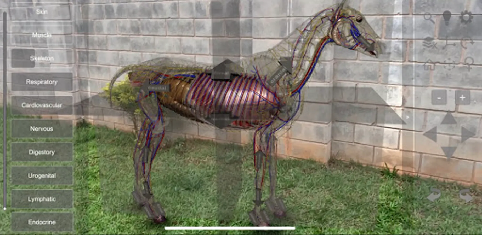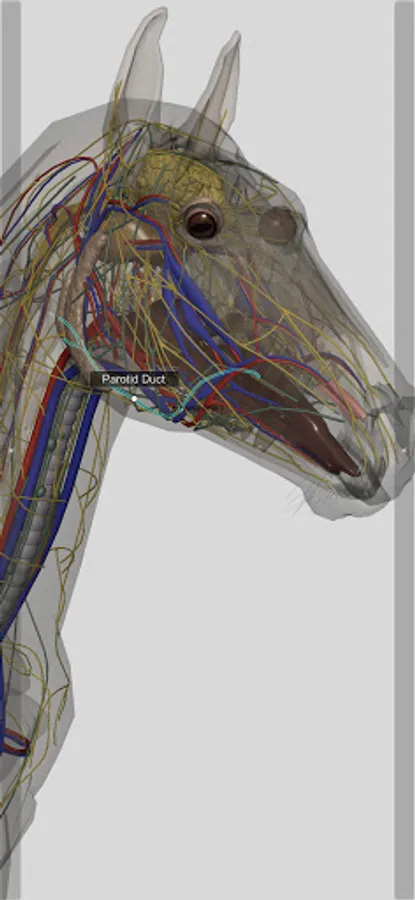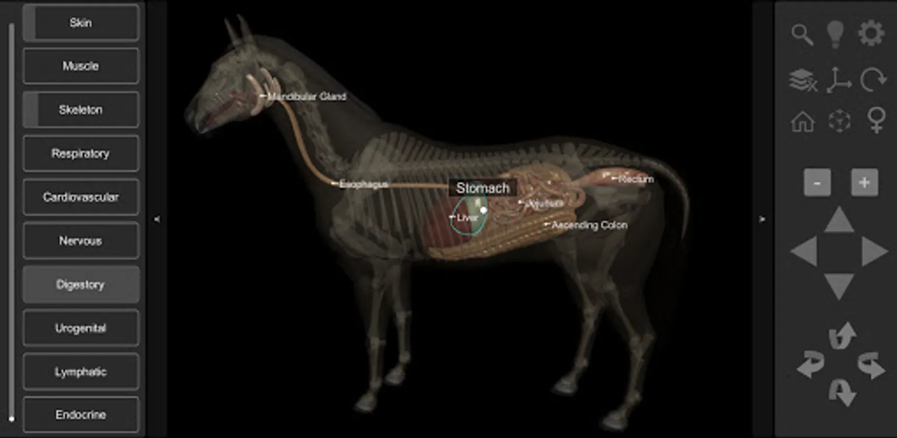 The 3D Horse Anatomy App lets you explore a detailed three-dimensional model of an Equine. Internal systems can be viewed and manipulated layer by layer or simultaneously with other layers, at various zoom levels. Individual anatomical structures can be highlighted and display a caption, or they can be removed to permit viewing of deeper structures.
