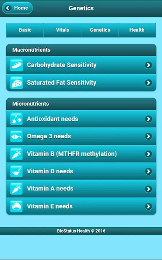 DNA Nutrition Tracker turns your smartphone into a personal dietitian, selecting foods for you based on activity level, fitness, weight modification goal and even genotype! Nutrition Tracker works at the level of your DNA, allowing users to take their raw genetic data from 23andMe, AncestryDNA or Family Tree DNA and create personalized nutrition reports that will help you eat right for your genotype.