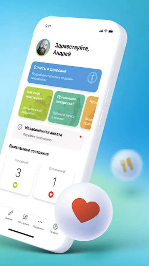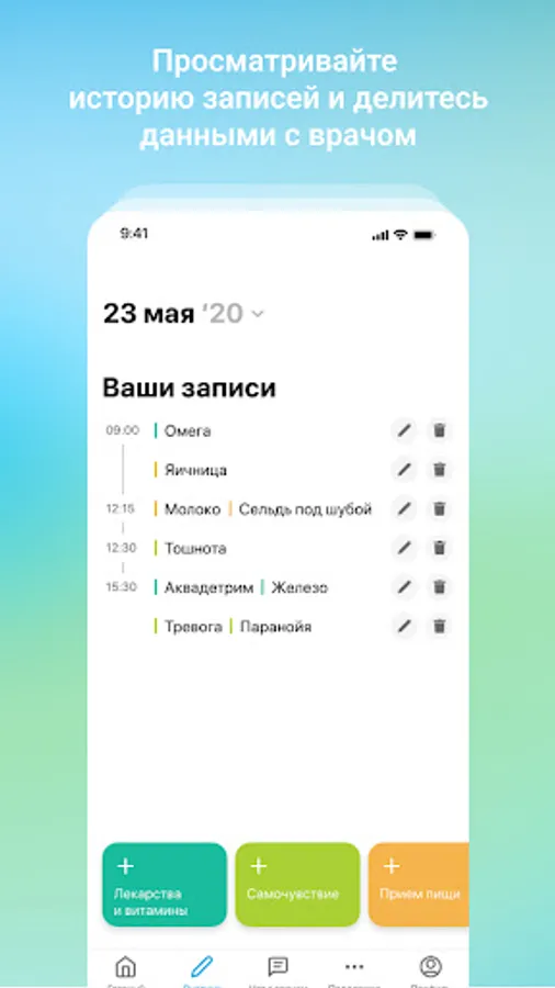 Write down meals and medicines, note your sensations and body signals. See how your habits affect your well-being and health. Share the diary data with your personal doctor - this will help him personalize therapy and prepare recommendations to improve your health.