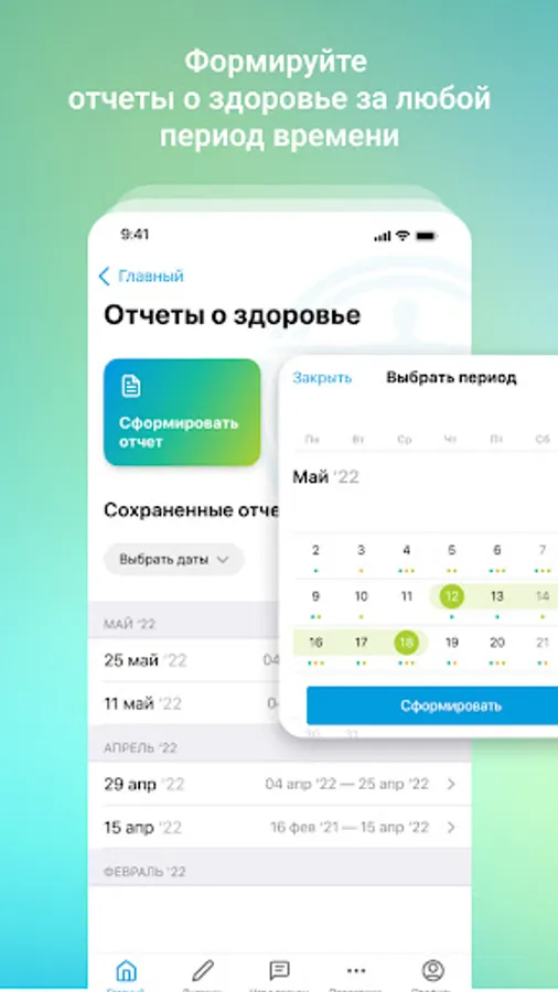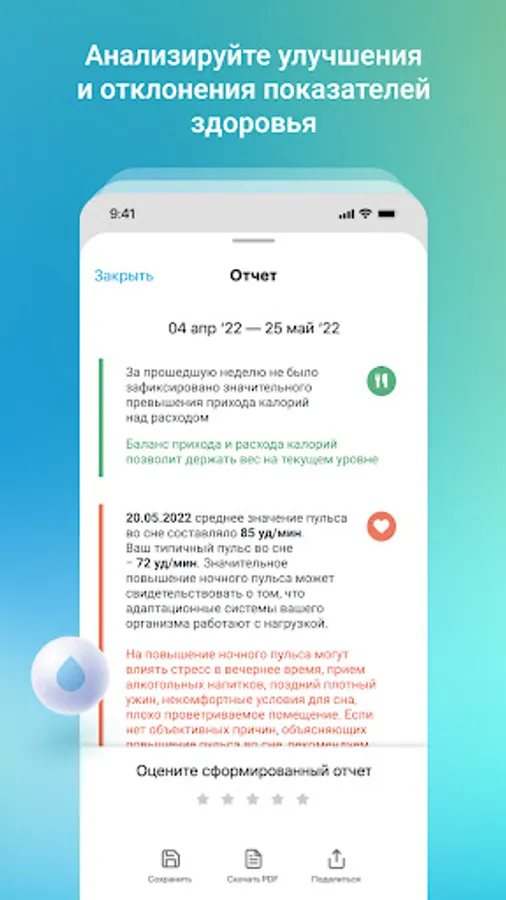 Generate a report with analytics of your health indicators for any period of time from 1 day to weeks and months. Watch for improvements, follow recommendations, and reduce your risk of disease.