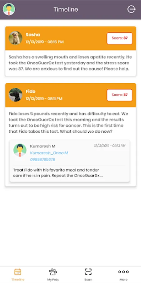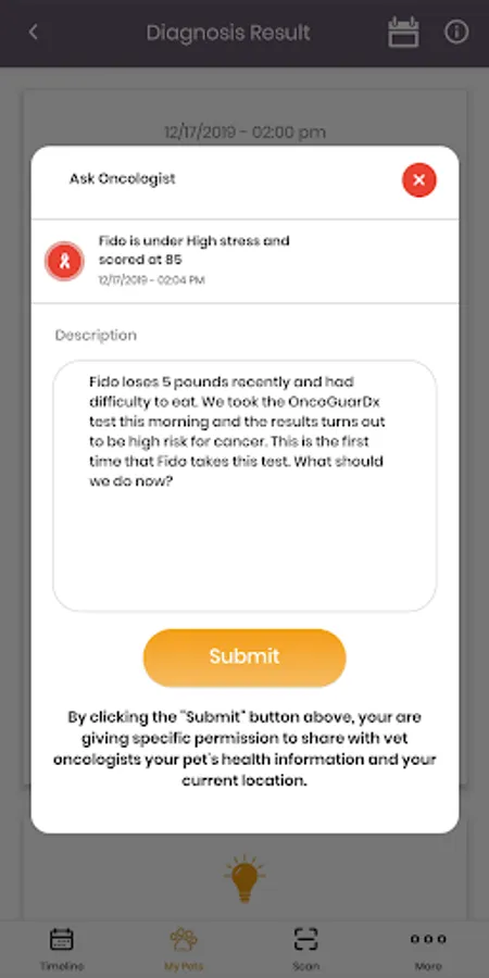 OncoGuarDx App is dedicated to OncoGuarDx kit, a real-time canine DNA stress test intended for at-home early cancer screening. The App can score OncoGuarDx test and allows pet owners to track the stress level of the pets, while provides a timeline chat with vet specialists if the pets are diagnosed of high risk for cancer.