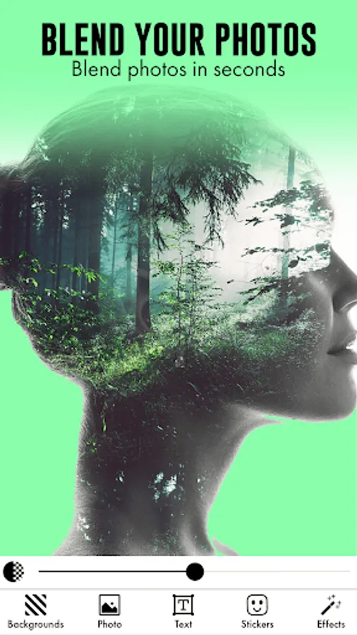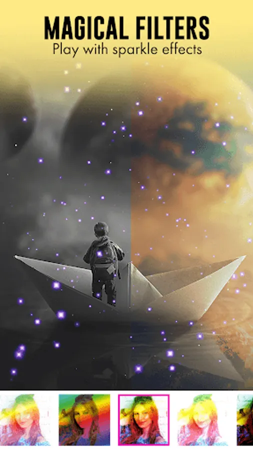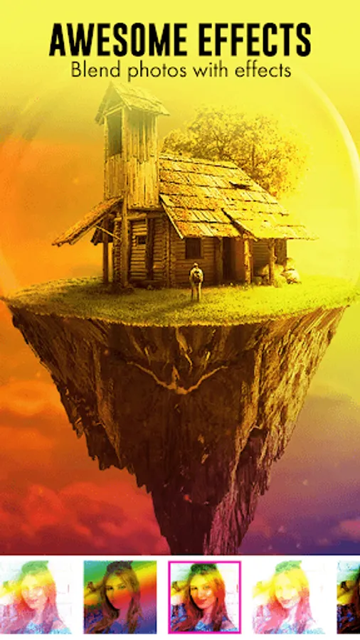 Easily blend your images by using the overlay or shape and apply the stunning filters, add text or funny stickers.