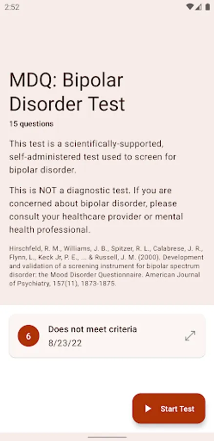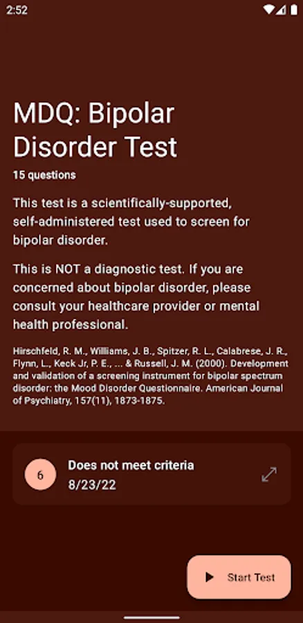 - Start Test: take the MDQ questionnaire to screen for bipolar disorder