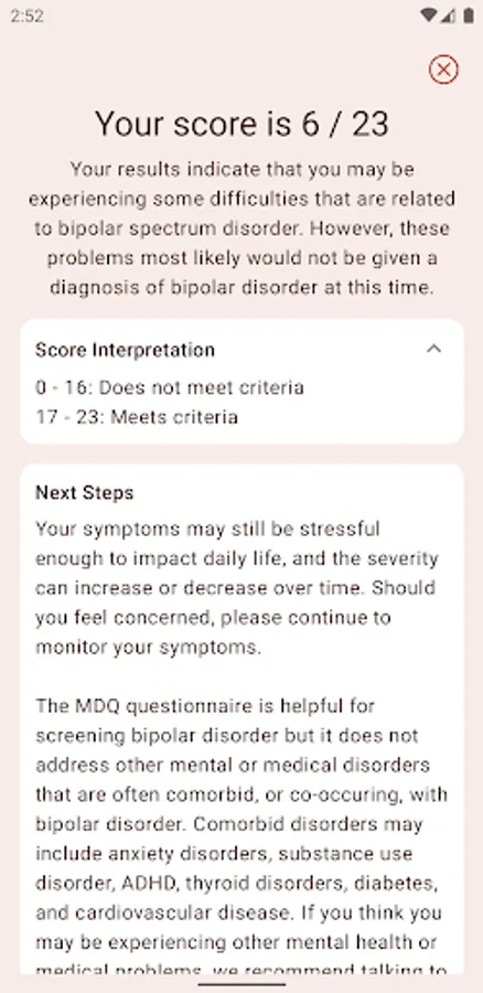 Disclaimer: The MDQ is NOT a diagnostic test. A diagnosis can only be provided by a qualified healthcare professional. Please consult a physician or mental health professional if you are concerned about bipolar disorder.