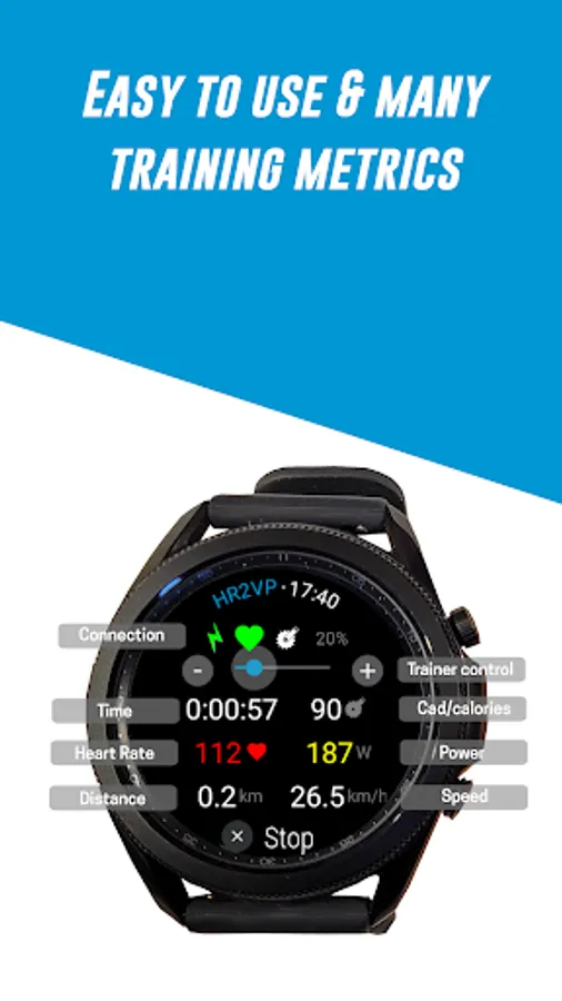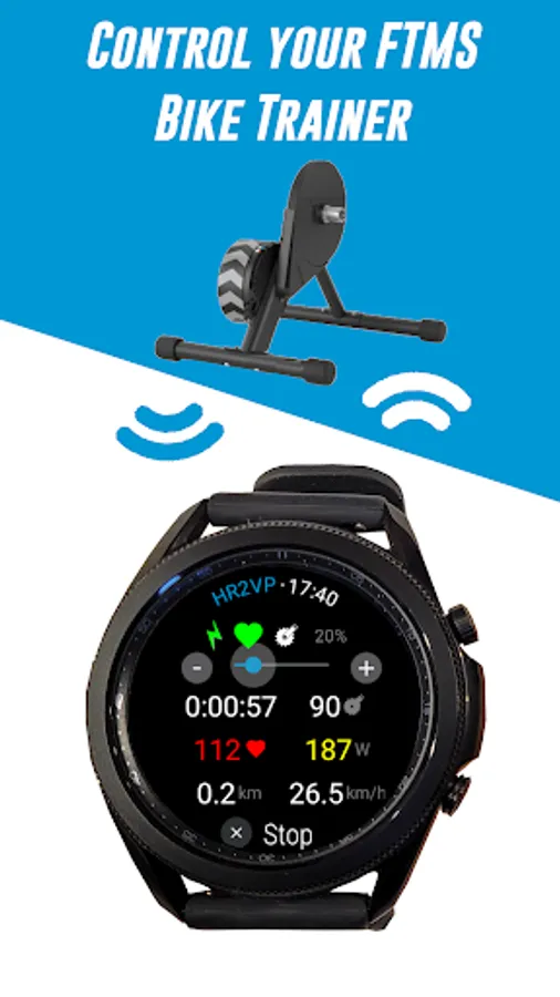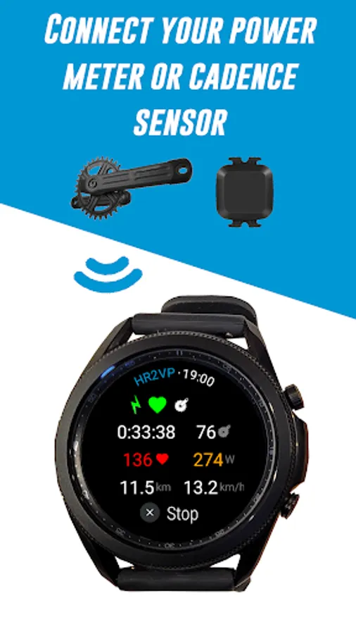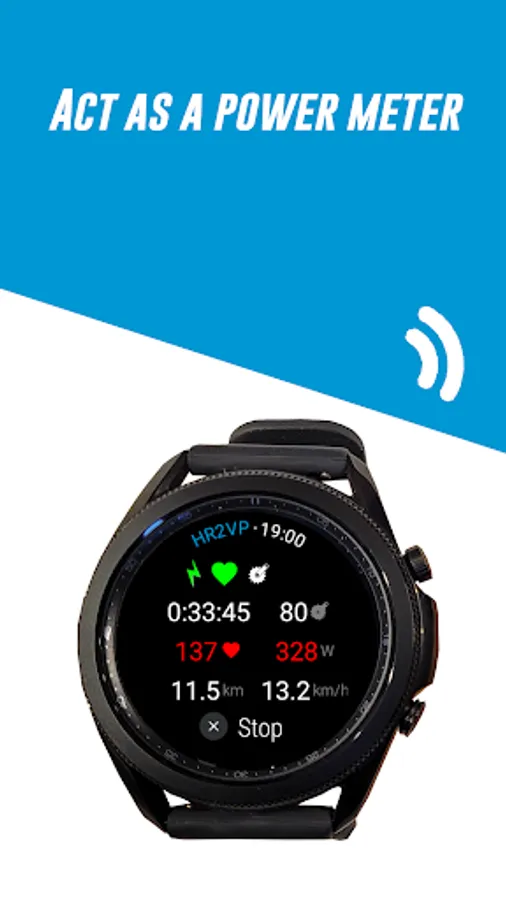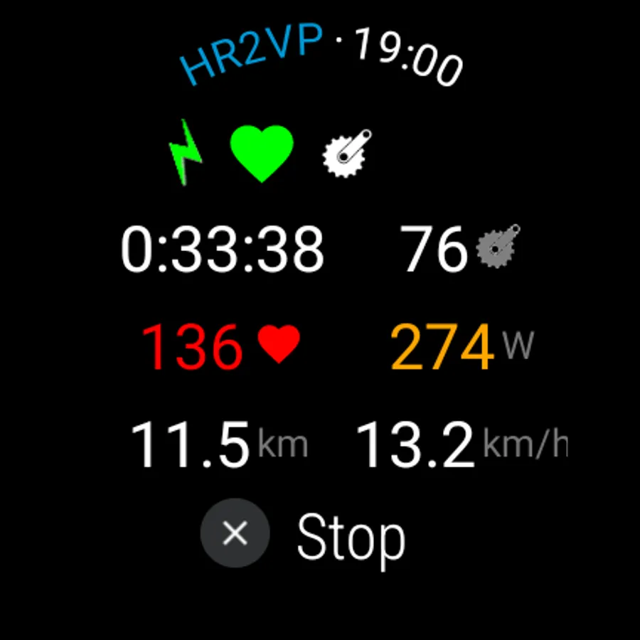 Connect your watch to indoor training apps or to cycling computers. Display and broadcast heart rate and power based on HR over Bluetooth Low Energy or ANT+ from your Wear OS watch to indoor cycling apps such as Zwift, Rouvy, Road Grand Tour (RGT).