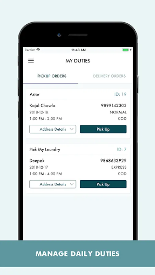 Each rider will then be able to view their Pickup & Delivery Orders under the My Duties section. After completing a particular order they will have to click on Pick Up or Deliver button to confirm that they have completed their tasks.