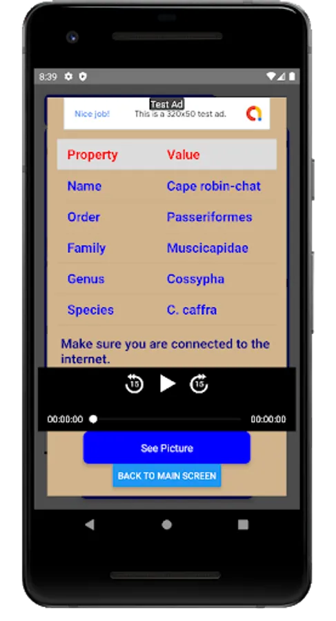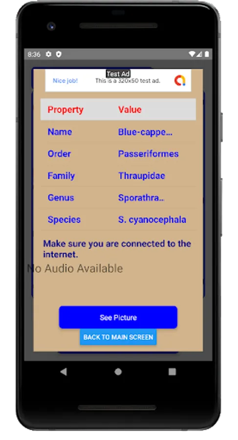 Find basic information about any bird by searching for its name from a database of more than 10000 birds. You can use two search criteria Starts and Contains. If you use Starts criteria and type Blue in the search box, all bird names that start with Blue , like ,Blue-crowned parakeet , Blue-fronted parrotlet, Blue pitta, etc. will be displayed in a dropdown. If you use Contain option and type masked in the search box, all bird names that include masked anywhere , like , White-masked antbird , Masked booby , Lowland masked apalis , will be displayed in the dropdown, After selecting the name, you can see the Order, Genus , species and family of that bird. You can also see its picture and hear its sound if present in the database.