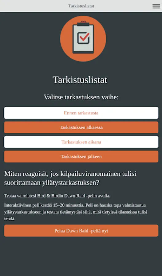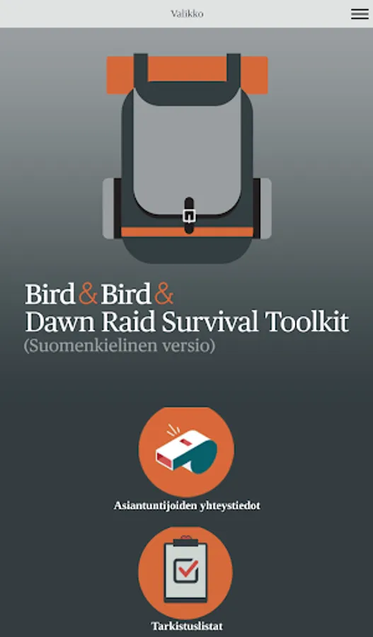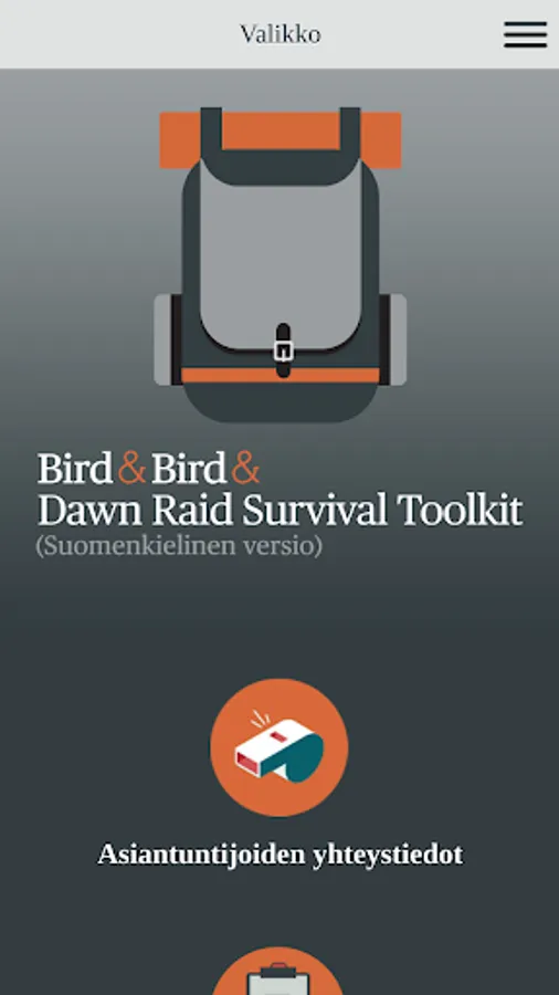 The Bird & Bird Dawn Raid app is designed to give you key information for before, during and after a dawn raid. It covers your obligations and rights, allowing you to minimize disruption and protect your business. The app also features frequently asked questions and emergency Bird & Bird contacts to provide clients with support at their fingertips.