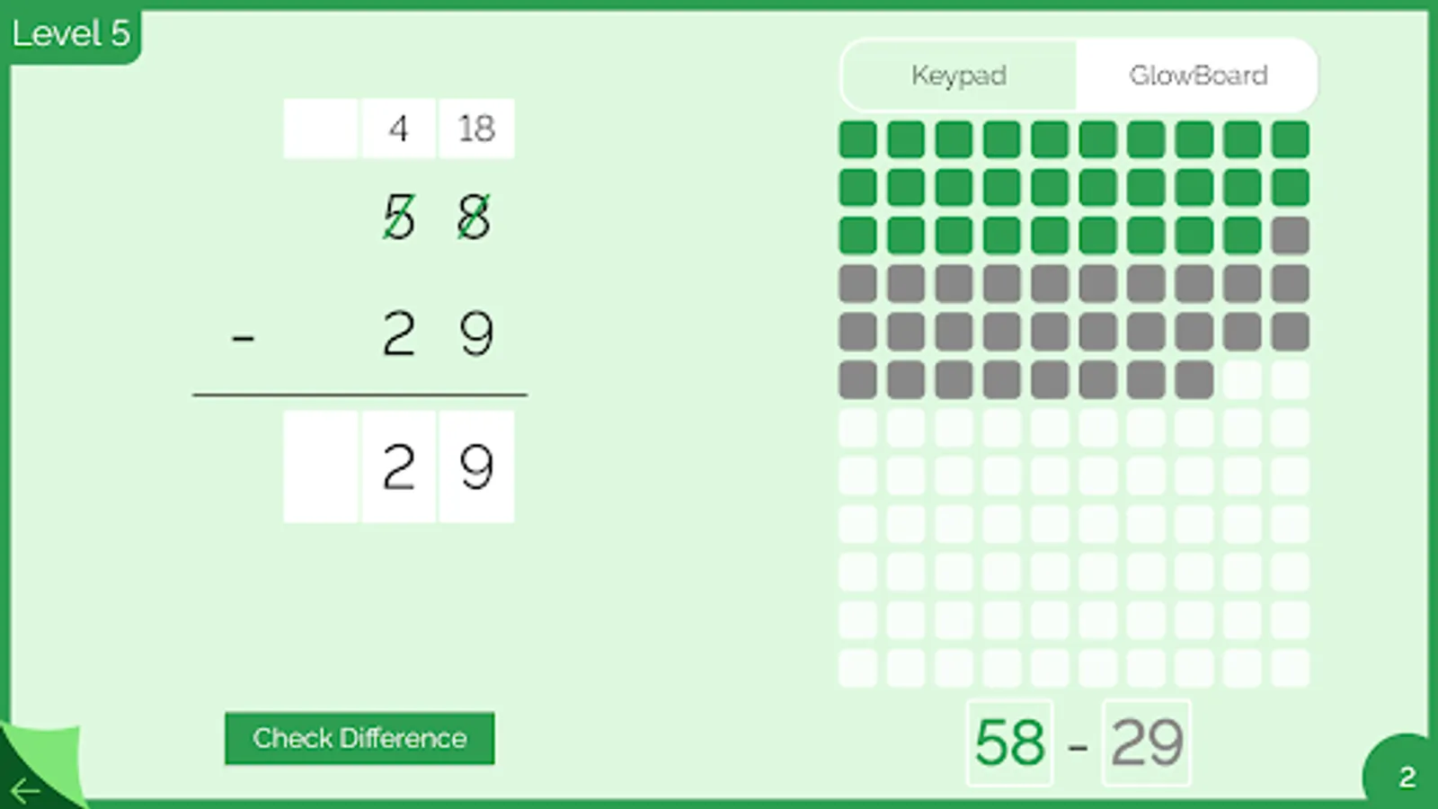 - Find: The app challenges students to solve missing number problems with the GlowBoard.