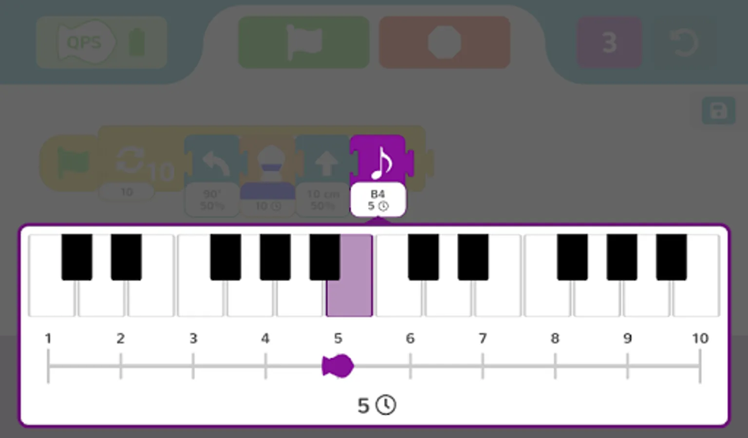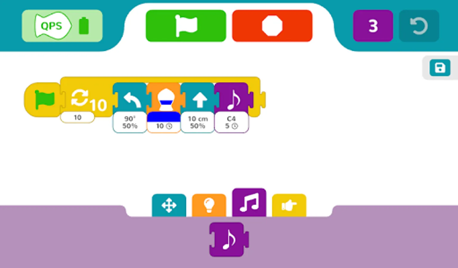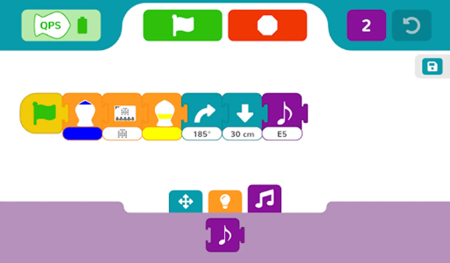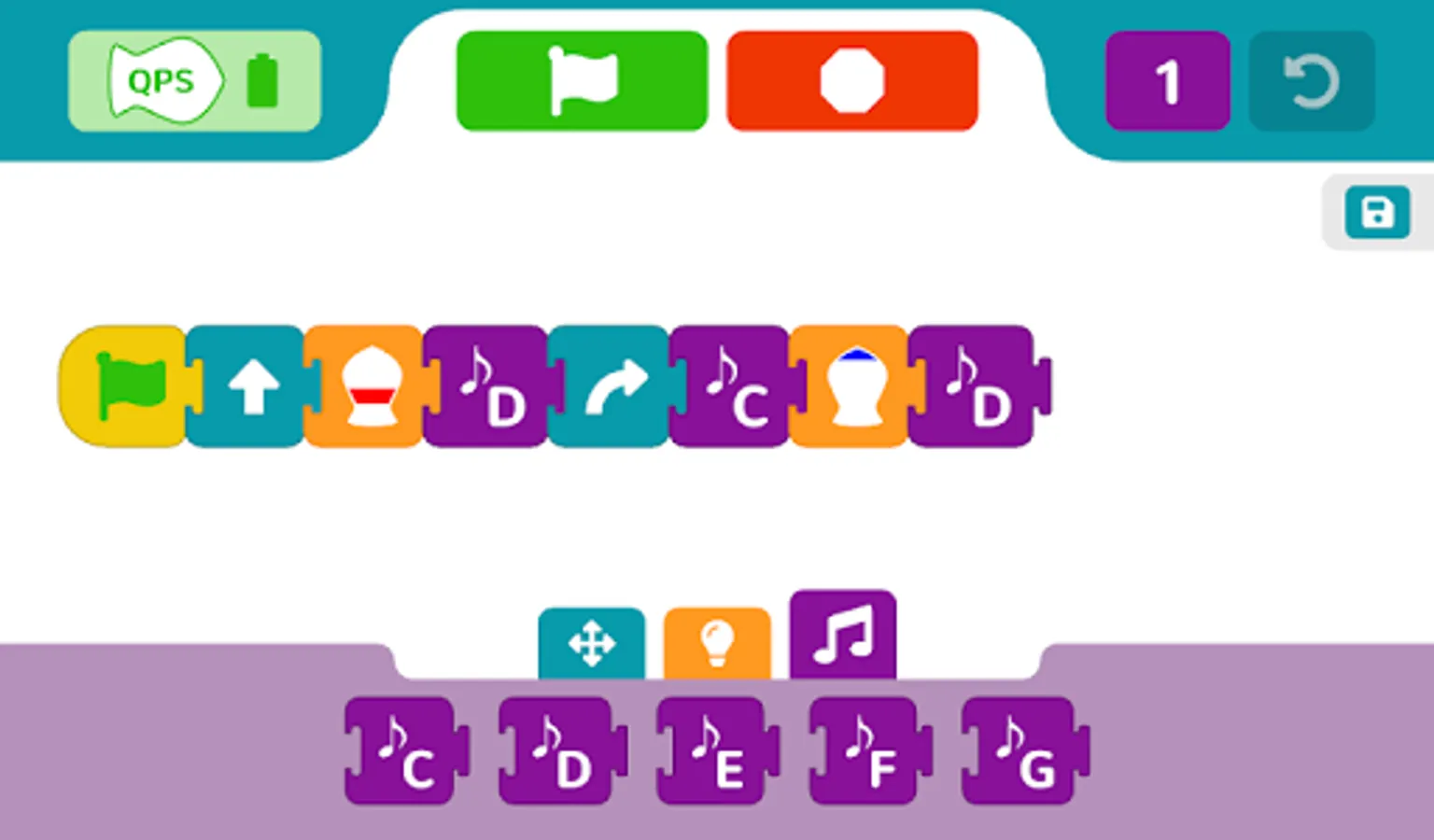 - Level 1 introduces sequencing. For example, users connect blocks to make the robot move forward, beep, and then turn left.