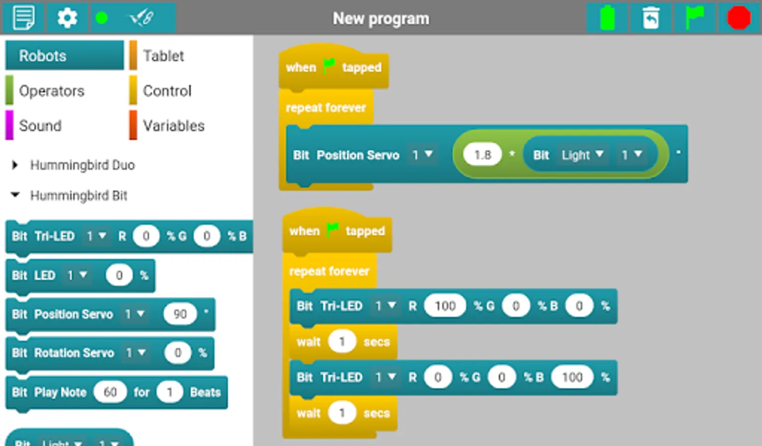 The BirdBlox app enables students ages 9 -14 to program Hummingbird and Finch 2.0 robots. Students drag together blocks to build programs that control the robot motors and lights, and they can use sensors to make the robot respond to its environment. Whether they are programming Finch to complete a maze or building a Hummingbird robot dog that barks when someone is nearby, the only limit is their imagination!