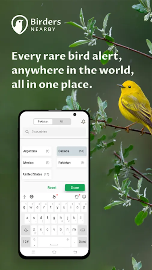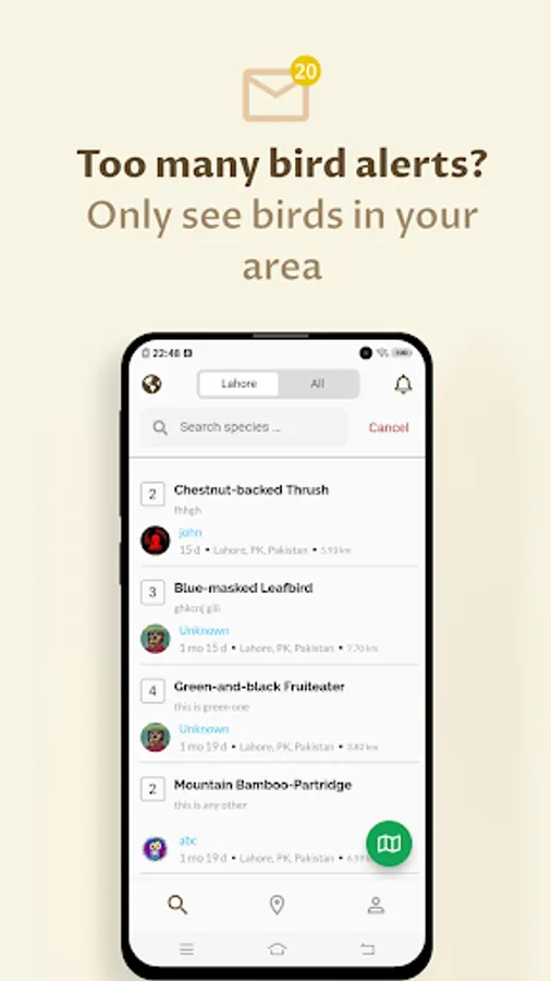 - Find Birders Nearby posts of bird sightings in your region in the list and map mode