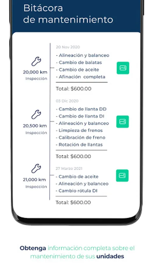 The app will allow you to keep a chronological and detailed record of each preventive or corrective maintenance performed on your vehicle.