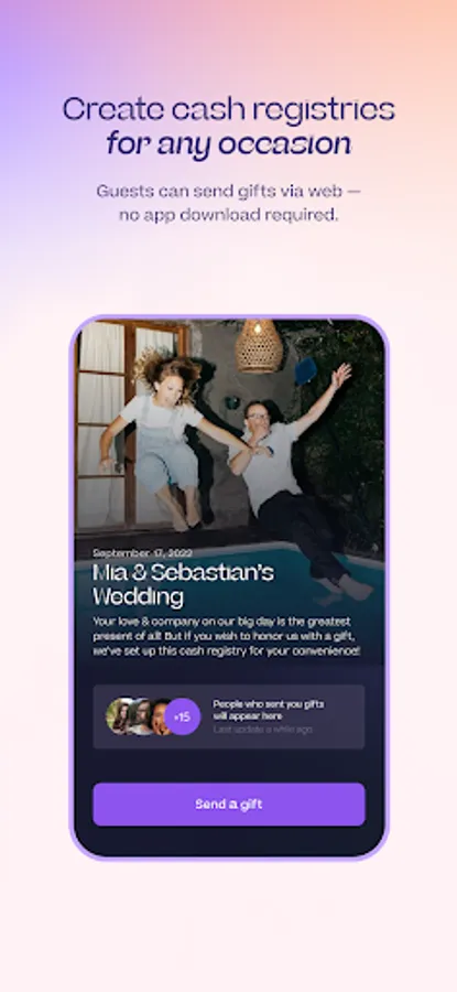 Send cash gifts instantly to anyone, for any occasion. To give, just define the amount, choose from a range of digital art for every occasion, and send via text or email. To receive, just tell us where to deposit. With one tap, the right gift is delivered instantly at any moment, for less than the price of a paper greeting card.