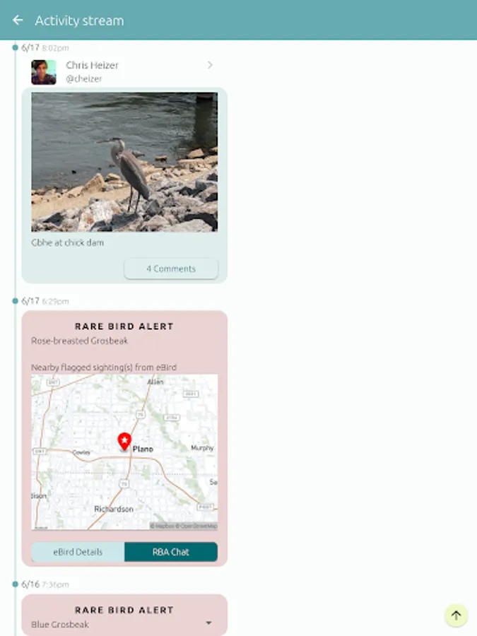 -Rare Bird Chats: Clicking on an RBA in your activity feed will transport you to a view of the Nearby Birder Chat focused on a radius around the rare bird's location. Find out if the bird is still being seen and discuss strategies for relocating it before making the trip!