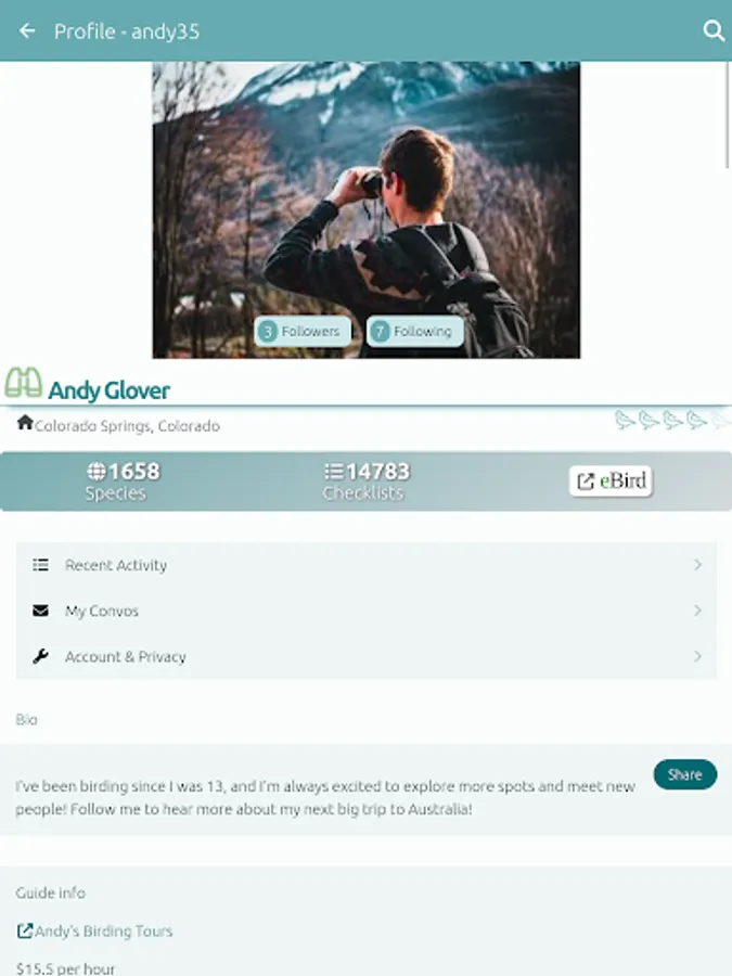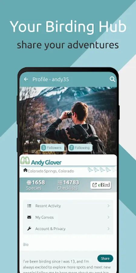 -Create a Profile: Introduce yourself, link your eBird stats, and discover friends to follow and connect with. Also mark patches you're familiar with birding and regions you're interested in traveling to. Our privacy settings allow control over who can see your details.