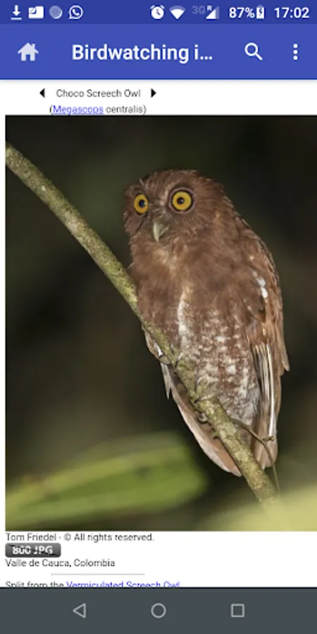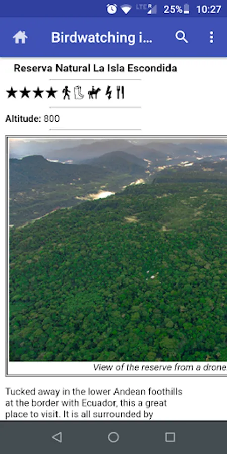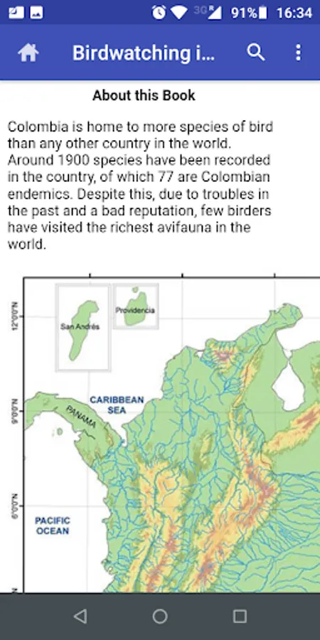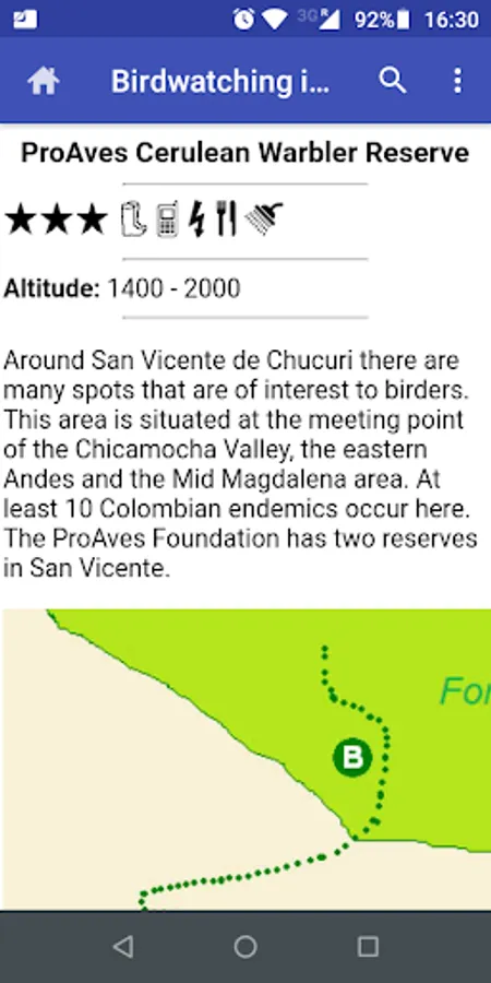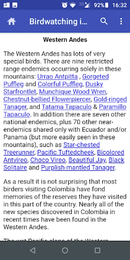 'Birdwatching in Colombia' is an Android implementation of the popular 2013 book 'Birdwatching in Colombia' (ISBN: 978-9090277851) by Jurgen Beckers and Pablo Florez. The 'app' has all of the content of the original book, with hundreds of updates as well as a few dozen new sites. The goal of the book is to help birders and photographers travel safely and problem free to the top birding sites, without having to pay for an expensive and unnecessarily restrictive tour package.