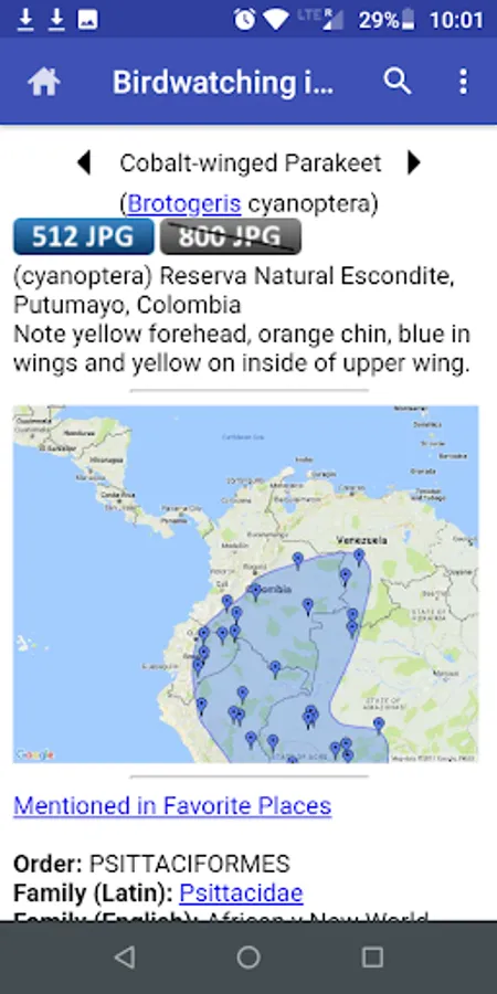 Scientific information and distribution maps are provided (downloadable) into the app for all species found in Colombia, as are photos for many species. This information is from the free 'Bird Data - Colombia' app.