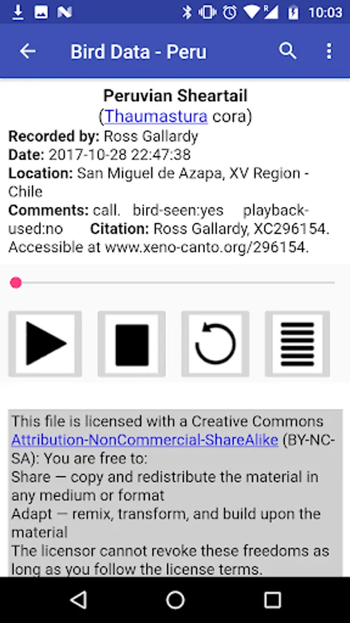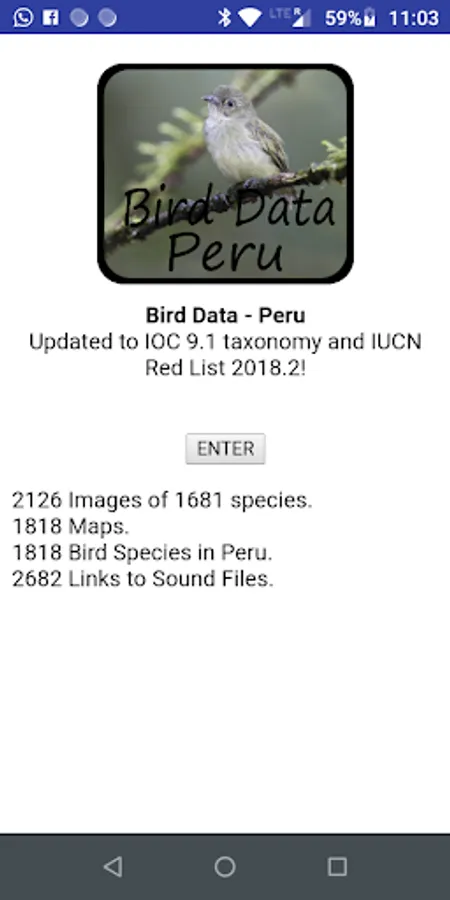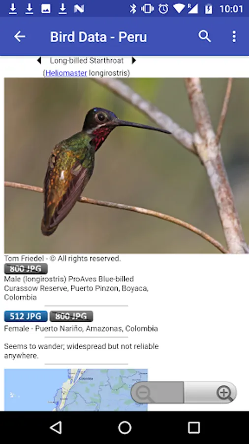 Bird Data - Peru is a field guide for the birds of Peru. It has taxonomic, range, subspecies, and other information for the 1800 species of birds found in Peru, one of the most bio-diverse countries in the world. Included are Peru-centered range maps for all species. Directly downloadable into the application are over 1600 photos of around 1300 species, and links to over 2000 bird songs and bird calls.