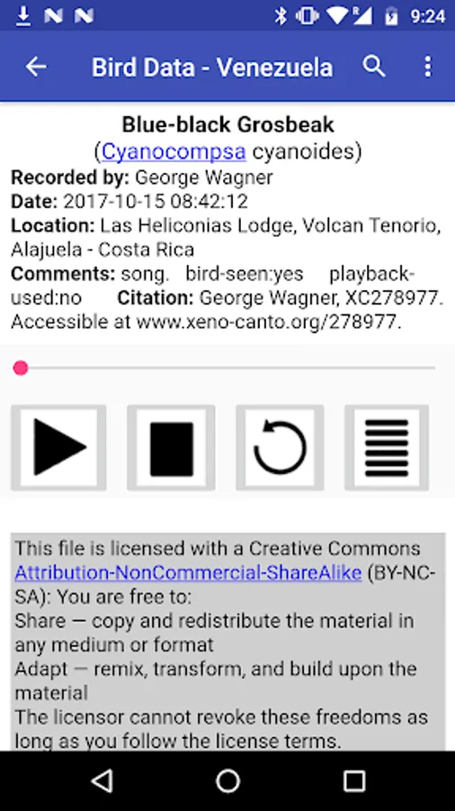 Media (images and sounds) can be downloaded individually. Photos and maps can be downloaded in bulk. Bird species can be navigated through taxonomy or native language (English or Spanish).