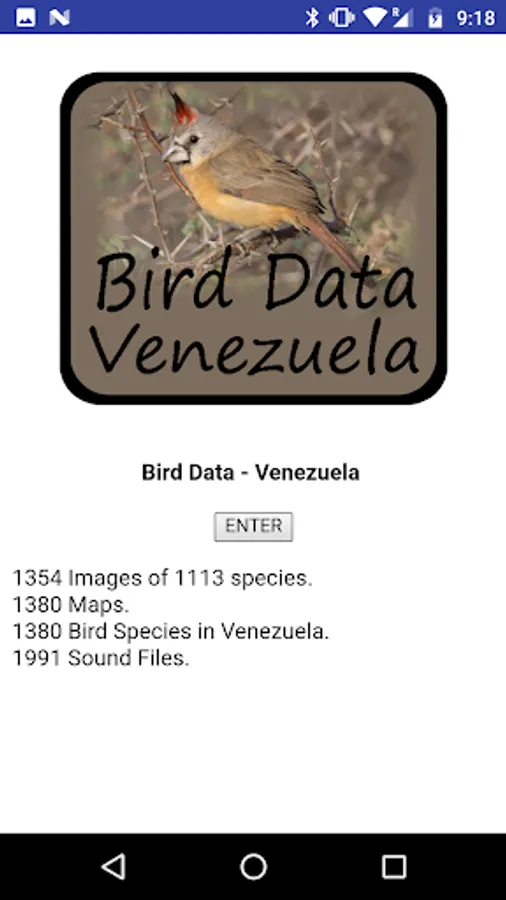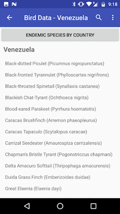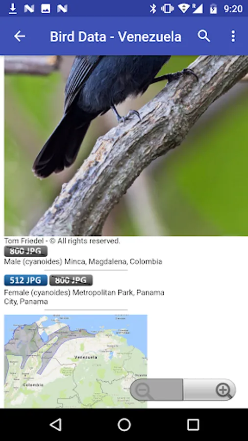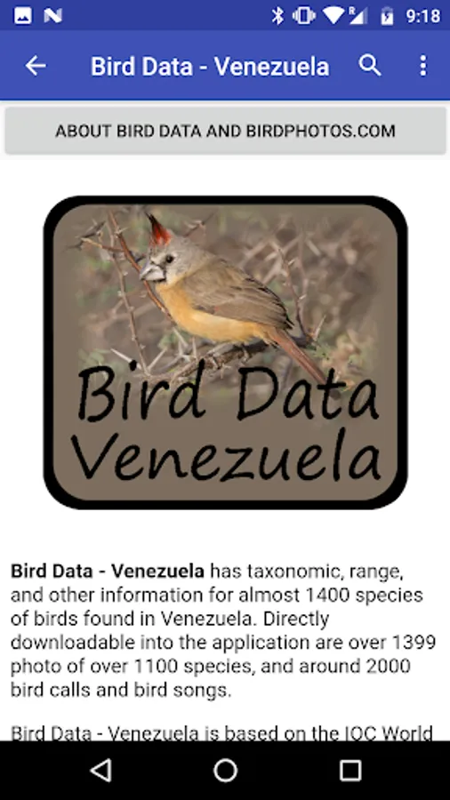 Bird Data - Venezuela is a field guide for the birds of Venezuela. It has taxonomic, range, subspecies, and other information for almost 1400 species of birds. Included are Venezuela-centered range maps for all species. Directly downloadable into the application are around 1400 photos of over 1250 species, and around 2000 bird songs and bird calls.