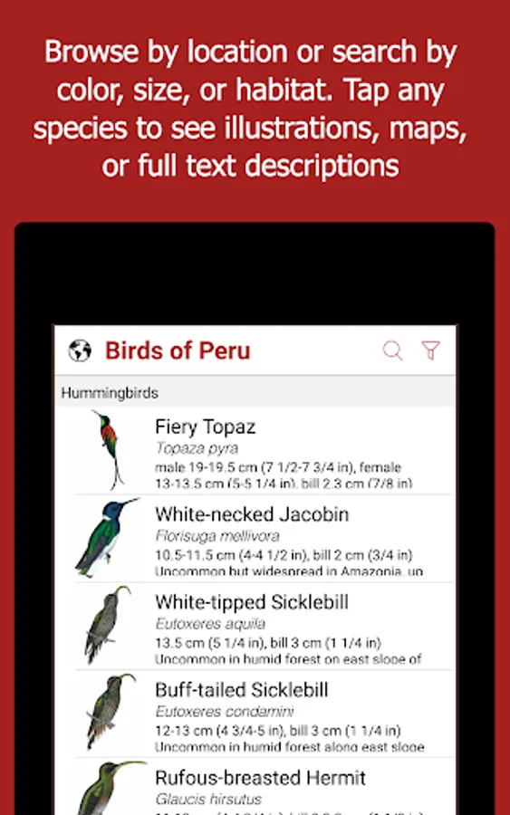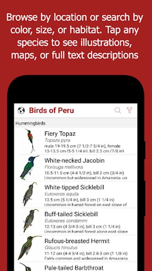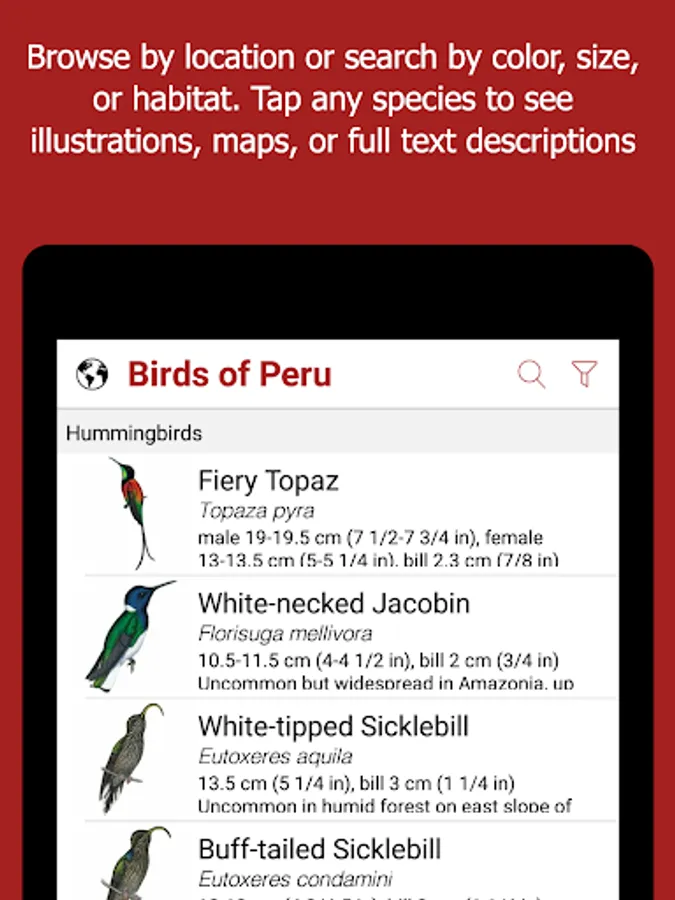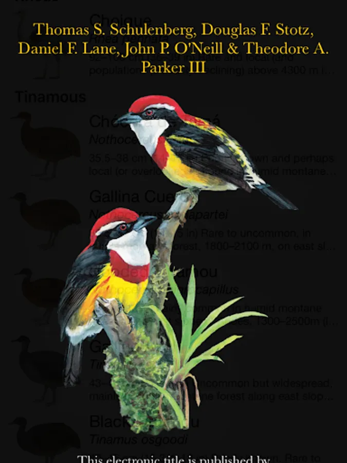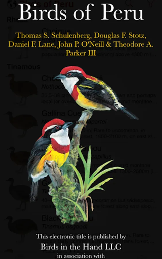 This easy-to-use application comes equipped with concise species descriptions, range maps, audio of bird calls, and detailed illustrations. Birds of Peru simplifies bird identification with an interactive Smart Search tool, and it makes it easy to keep track of bird sightings with an updatable life list. Birds of Peru is an important and must-have tool for all bird enthusiasts traveling in Peru, and is also useful in Colombia, Ecuador, the Brazilian Amazon, and Bolivia.