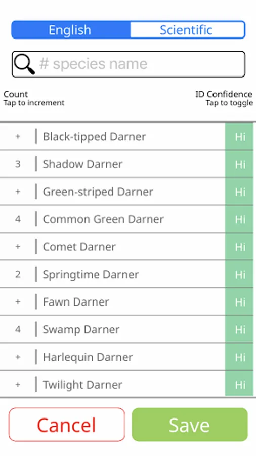 - Easily toggle between display of English and Scientific names.