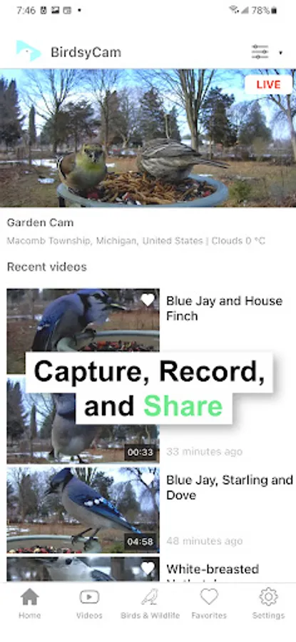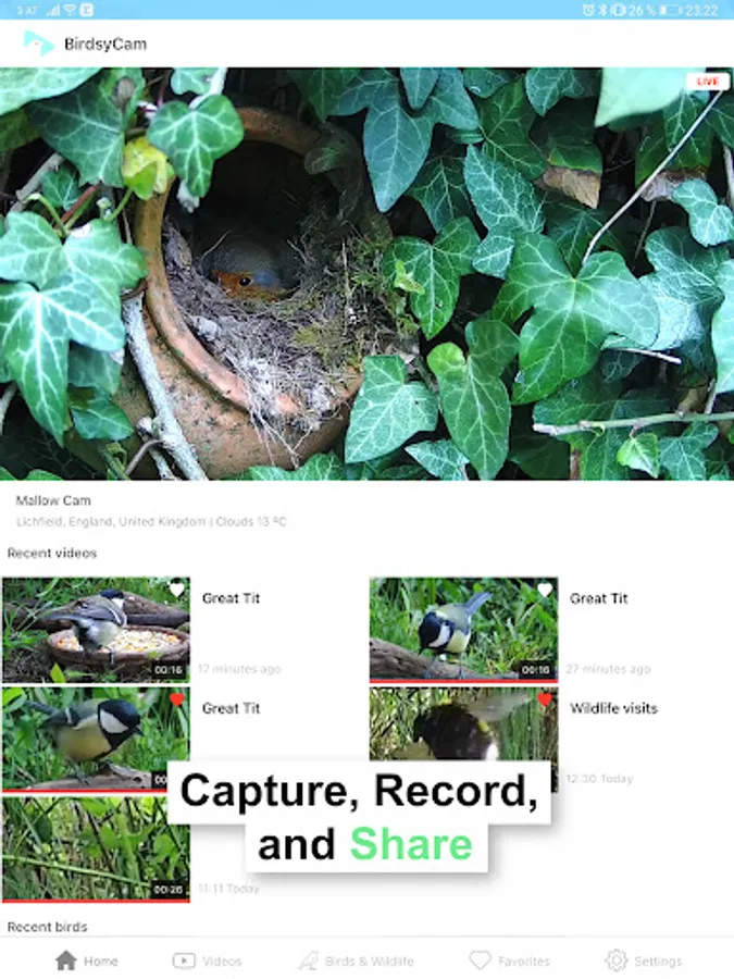 Birdsy isn't just a wildlife identifier—it's a live portal to urban wilderness. Our state-of-the-art live streaming feature captures birds and other wildlife in stunning HD. Birdsy lets you keep an eye on all the magic of nature and wildlife in your backyard that you never knew existed, anytime, anywhere.