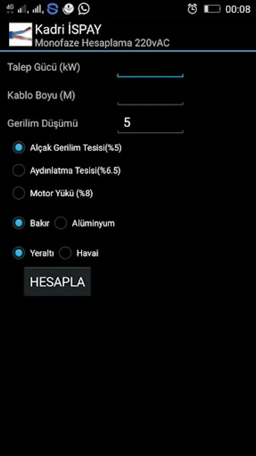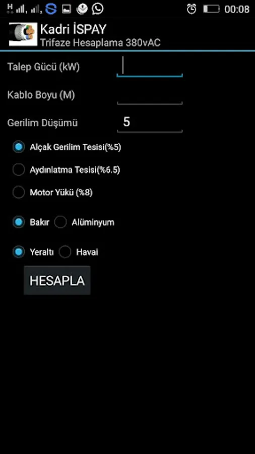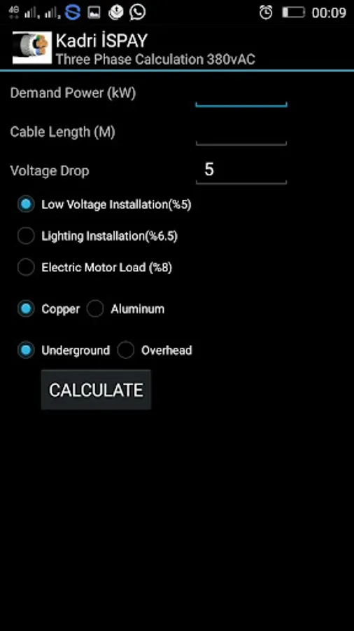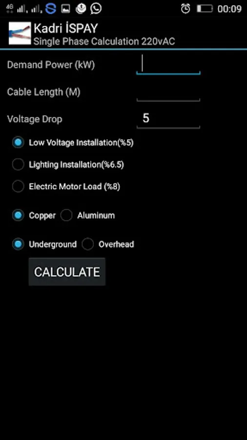 Entered power demand (kW) and cable length (m) by the voltage drop should be used in power plants to exceed 5% copper cable section (mm2) accounts.