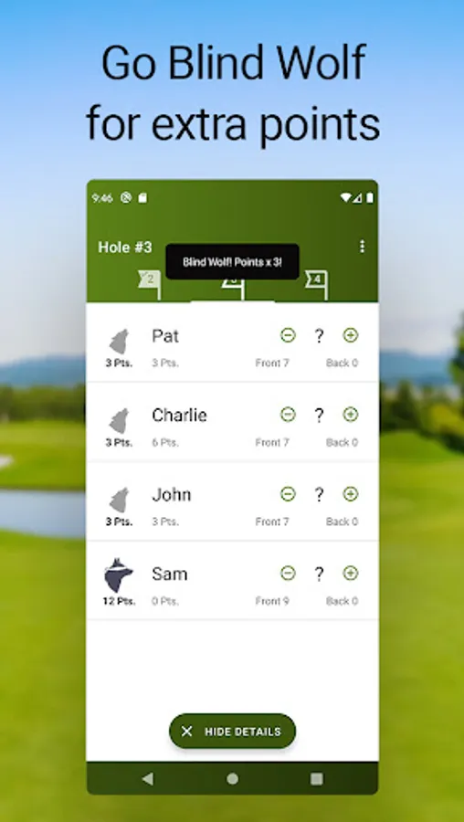 - "Blind Wolf" feature that will multiply point values. A player calls "Blind Wolf" on a hole before anyone tees off.