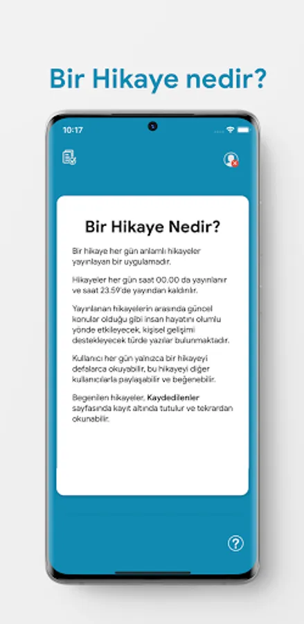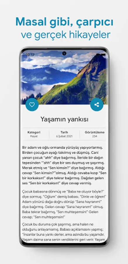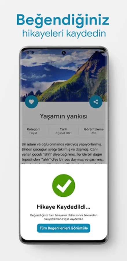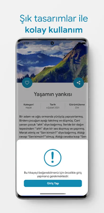 A story is an application that publishes meaningful stories every day. Stories are published every day at 9:00 am and are unpublished at 8:59 pm. Among the published stories, there are articles that will positively affect human life and support personal development as well as current issues. User can only read one story over and over each day, share and like this story with other users. Liked stories are recorded on the page and can be read again.