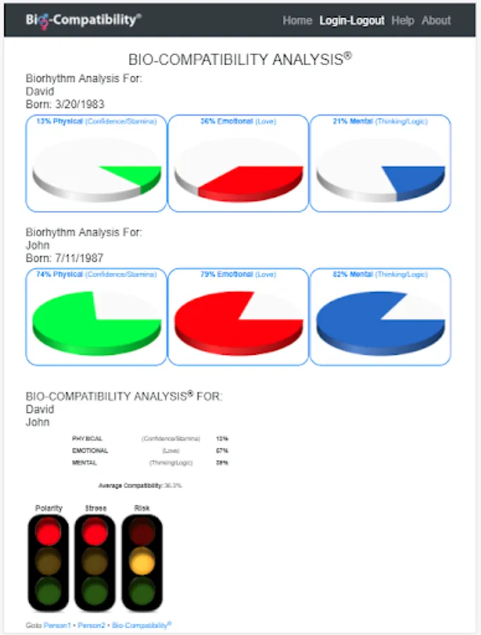 You can now find the love of your life. No need to settle for less. If you have been getting involved with people who make you unhappy, a Bio-Compatibility Analysis® can help you to determine why. The data is based upon your birth date. You will be surprised how amazingly accurate it is. This full, paid version offers complete analyses of your physical, mental and emotional compatibility with others.