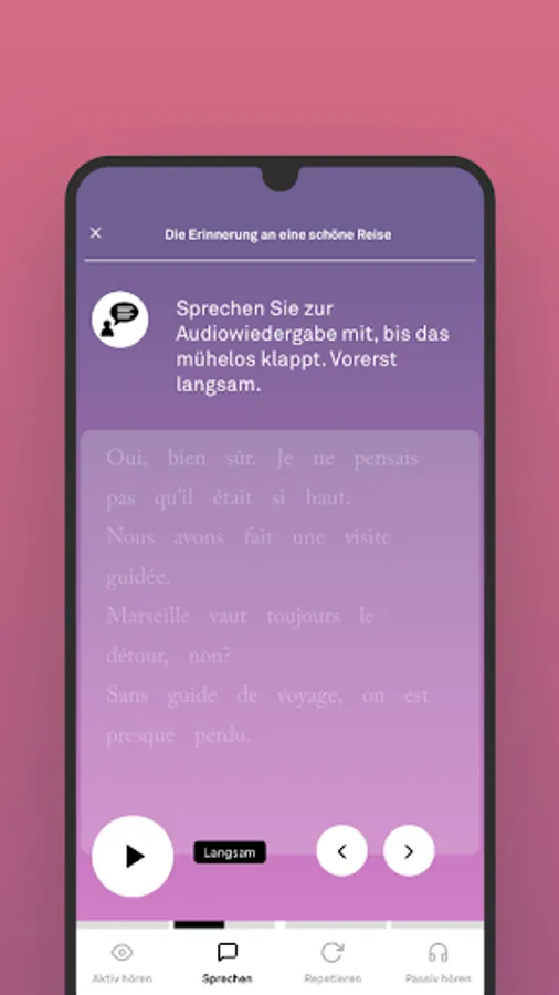 You hear a newly learned text and speak softly or silently along with it. At first slowly, then at the original pace.