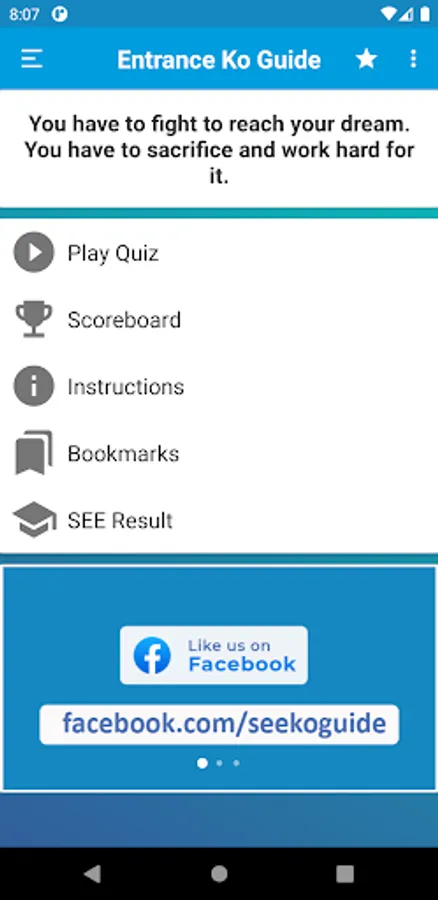 "Entrance Ko Guide" is an entrance preparation app for post-SEE students. It contains questions on the 7 different subjects with general knowledge (G.K). You can also see the result of SEE with and without mark-sheet.