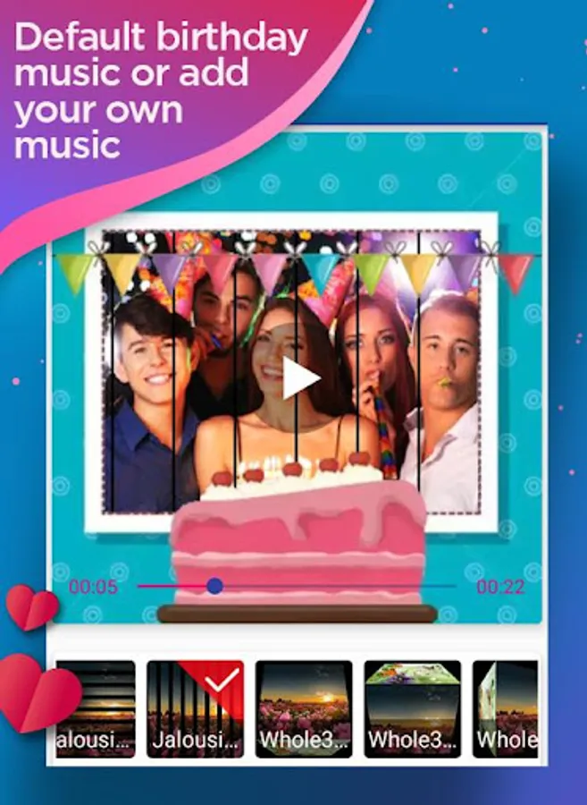 It's never been easier to make beautiful slideshows out of your birthday pictures! "Birthday video Maker" is a perfect app for doing this! Transform your birthday into something magical and save everlasting memories via this slideshow maker app! This awesome app provides you with a great variety of birthday stickers and frames you can choose from! Capture those moments that take your breath away and make a special and unique surprise for the people you love! Make some amazing videos out of your favorite funny pictures and enjoy the most beautiful slideshows created by your own artistic hands!
