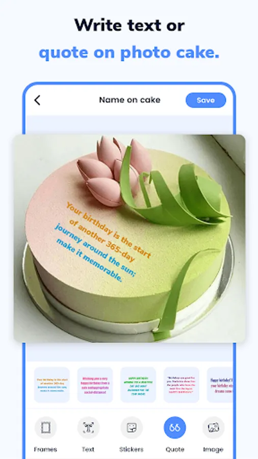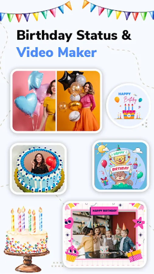 Birthday Status & Video Maker allows you to make a birthday video for someone special. Write your name on multiple cake photos. Place a person's photo on multiple cakes to send unique birthday wishes.