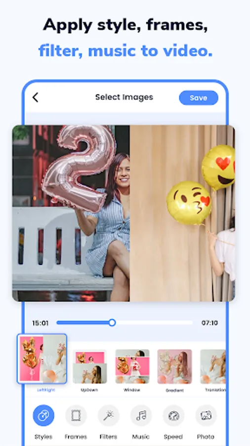 Make a birthday video by importing multiple photos from the gallery, adding music from the file manager, and trying multiple frames and filters to get the best result for free in a minute.
