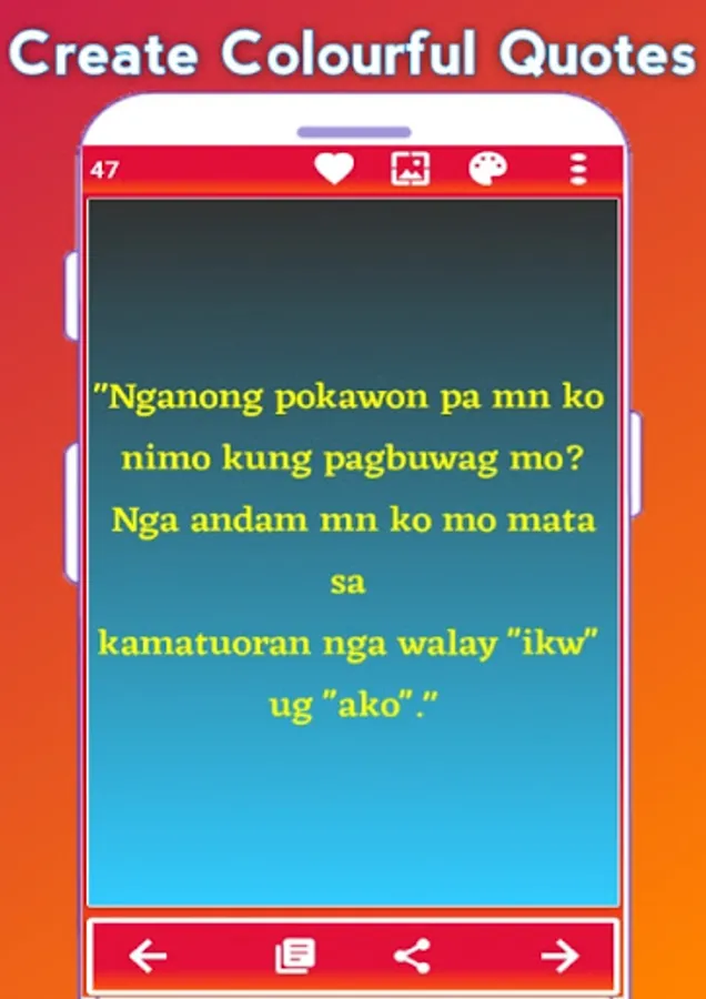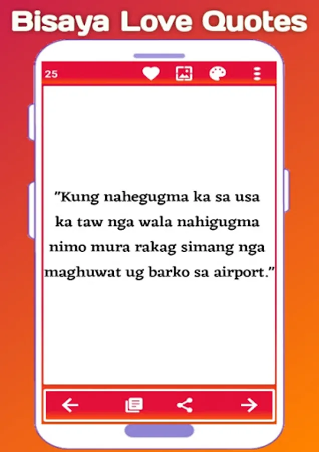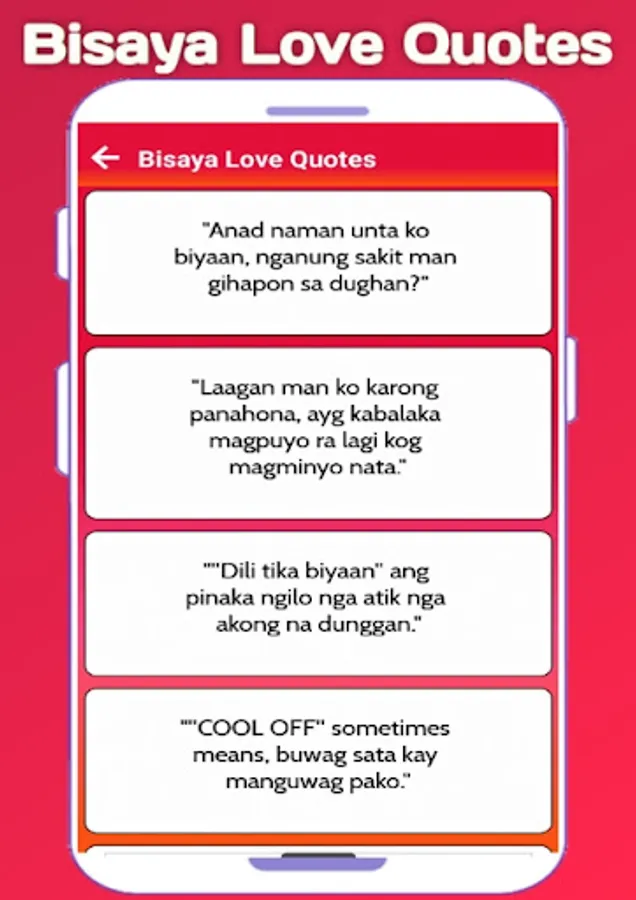 If you are looking for lovely bisaya quotes, this is definitely the app for you as you will find all kinds of love quotes that you can share with your girlfriend , boyfriend or friends and also relatives in a fast and simple way and make everyone happy.