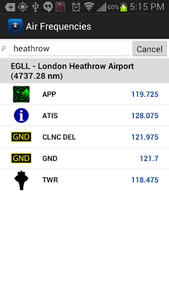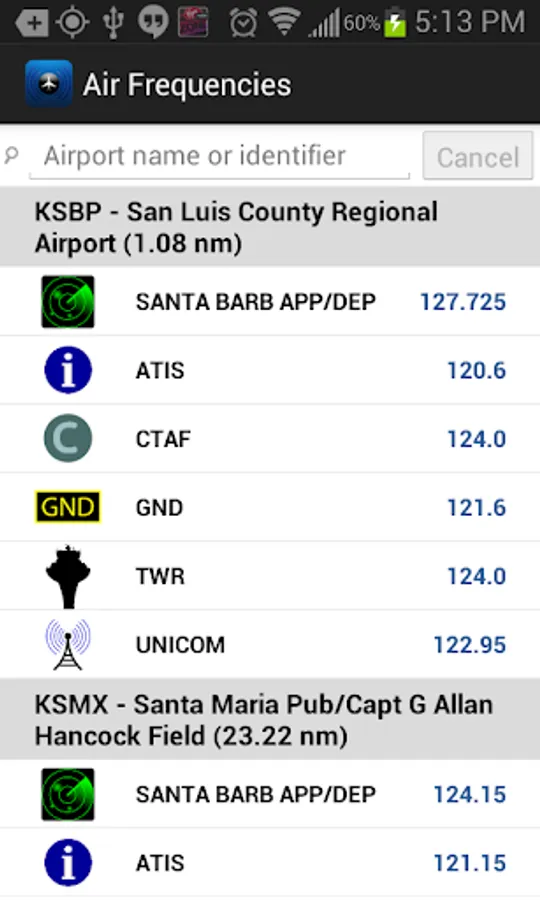 Air Frequencies is a reference for pilots or airplane fanatics using aviation scanners that lists frequencies of closest airports by using your device's GPS. For airports further away, there is a search bar to find airports by name or identifier. Uses FAA international airport data with over 44,000 airports worldwide. No internet connection required after downloading. Lists all available frequencies, e.g. tower, ground, CTAF, approach/departure, ATIS, CD, UNICOM, etc.