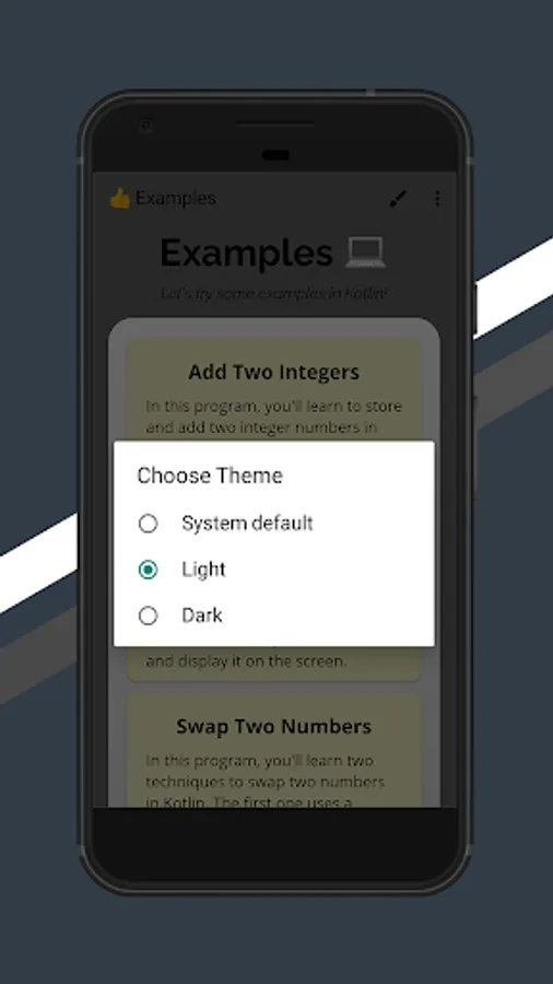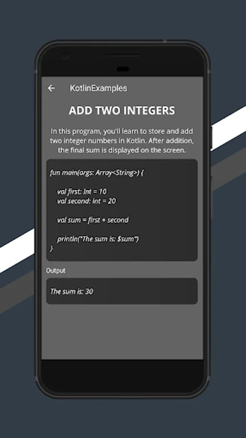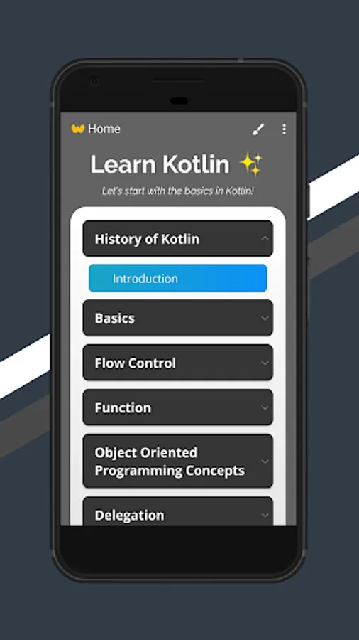 This app covers all the important parts of Kotlin and it's created to improve the thinking of varied issues in regards to the basics of Kotlin programming. It consists of relevant subjects and their syntax and source code.