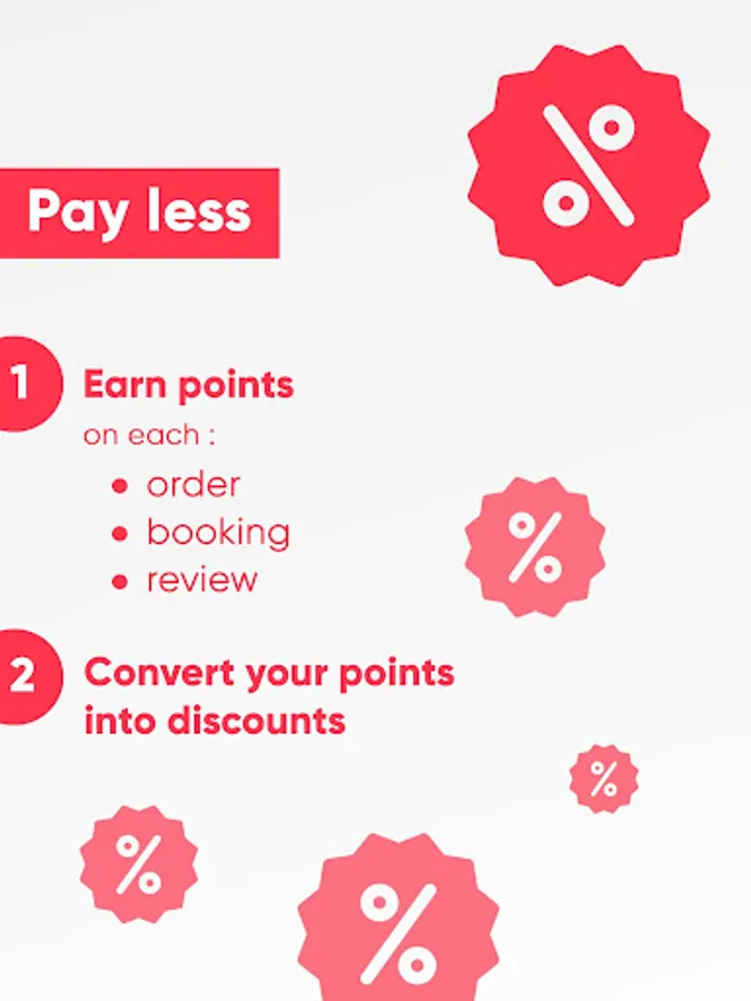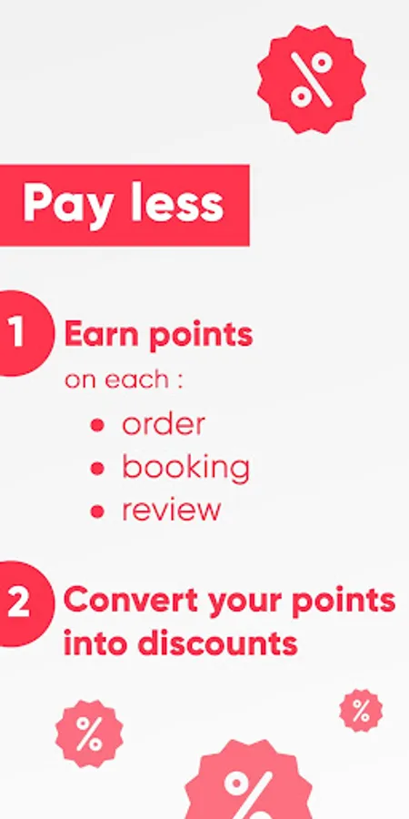 Pay less with our loyalty program: earn points for every order, booking or review, and convert them into discounts.
