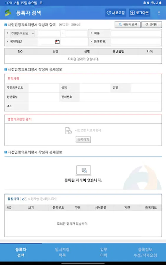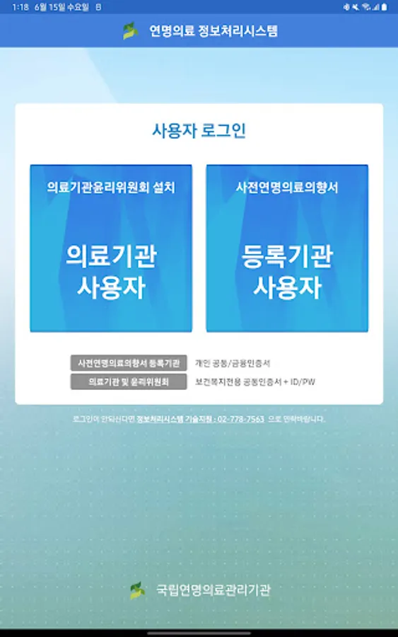 The life-sustaining medical information processing system application is one of the information processing systems operated by the national life-sustaining medical management institution in accordance with the 『Life-sustaining treatment decision act』. It is a service to support the creation of related documents at the medical institution where the pre-information of life-sustaining medical care registration institution and the medical institution ethics committee are installed. . Therefore, only those who have received user approval from an institution that has already been designated or registered in the information processing system (https://intra.lst.go.kr) can access the service.