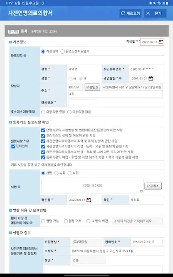 The prior letter of intent registration institution is designated by the Ministry of Health and Welfare in accordance with the 「Life-sustaining treatment decision act」 and supports the preparation and registration of the advance directive on life-sustaining treatment, and the task of notifying and managing the advance directive on life-sustaining treatment requested to be registered, changed, or withdrawn to the management organization is responsible for To this end, the life-sustaining treatment information processing system application supports registration agency users (consultants) with application tasks such as preparation, change, and withdrawal of advance directives for life-sustaining treatment. The prior written, changed, or withdrawn letter of intent for life-sustaining treatment through the application must be confirmed by the registration authority manager (registrant) and notified to the national life-sustaining treatment management organization.