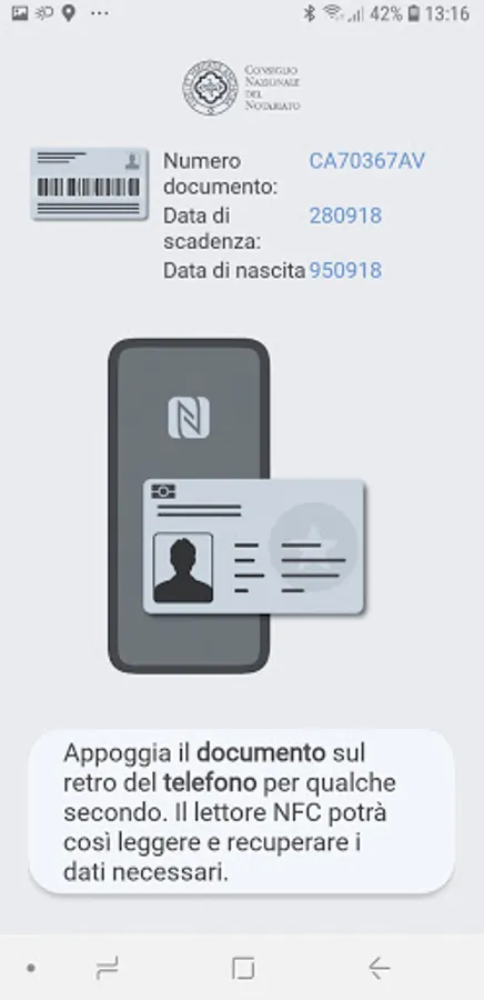 • Hold the document close to the back of the smartphone for a few seconds. The NFC reader will thus be able to read and extract the data present;